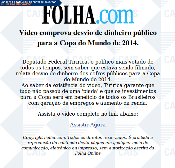 | comentário | A fraude se passa por uma notícia do site folha.com sobre um suposto envolvimento do deputado Tiririca com desvio do dinheiro público destinado para a Copa de 2014. O link para o suposto vídeo leva a um software malicioso que foi identificado como Trojan-PWS.Win32.Delf... (leia mais) | |