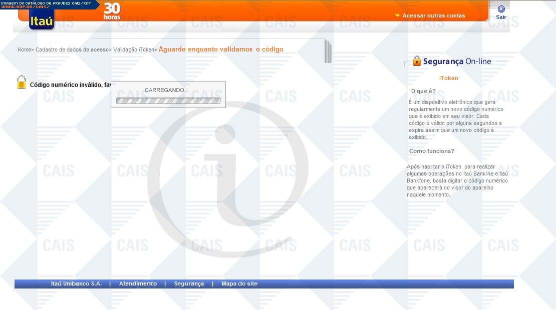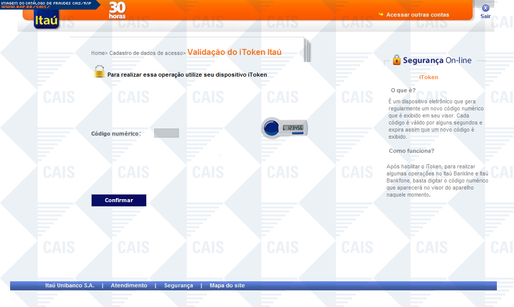| comentário | Comunicado falso do banco Itaú informando que a vítima deve realizar a atualização de rotina do dispositivo iToken. A mensagem contém um link que leva a uma página falsa, destinada a coletar dados da conta bancária da vítima. | |
