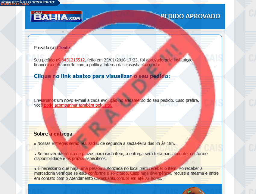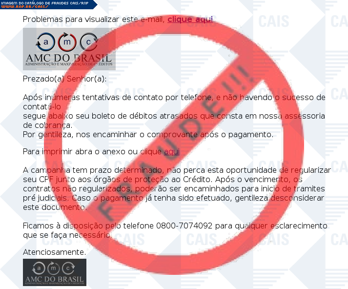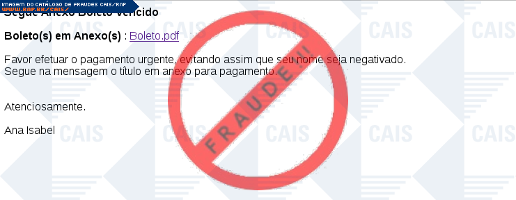 Esta página tem função informativa e educativa. Exibe uma coleção de imagens de phishing scam (fraudes eletrônicas) ou malware (código malicioso) veiculados por meio de spam (e-mail não-solicitado). Trata-se de conteúdo exemplificativo, não exaustivo, uma vez que não é possível contemplar todos os casos de fraudes existentes. Assim, caso você tenha conhecimento de um exemplar que não esteja aqui presente, isto não significa que não seja válido ou real. Inclusive incentivamos que você o envie para análise do CAIS para que, se for o caso, passe a integrar o nosso acervo.