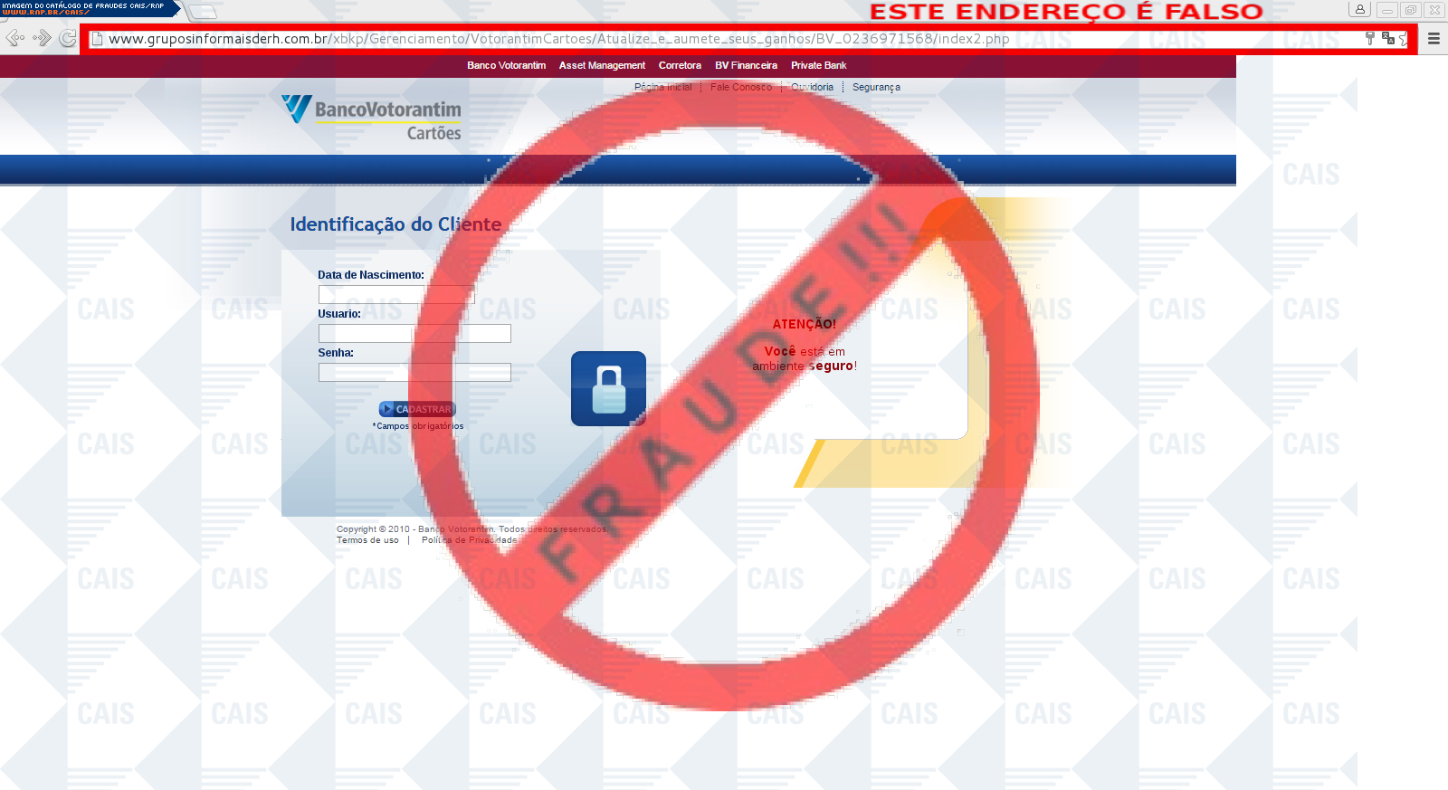 | comentário | A vítima recebe uma mensagem contendo uma atualização de sua conta no Banco Votorantim no link disponibilizado, no entanto a página é falsa destinada a roubar as informações do usuário. | |
