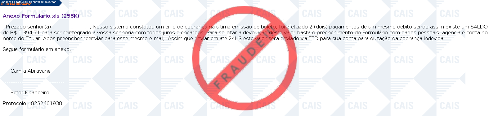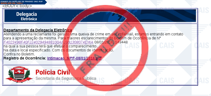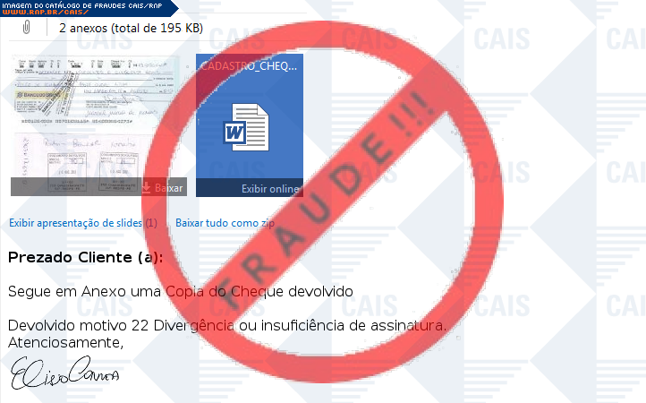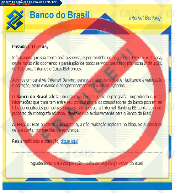 Esta página tem função informativa e educativa. Exibe uma coleção de imagens de phishing scam (fraudes eletrônicas) ou malware (código malicioso) veiculados por meio de spam (e-mail não-solicitado). Trata-se de conteúdo exemplificativo, não exaustivo, uma vez que não é possível contemplar todos os casos de fraudes existentes. Assim, caso você tenha conhecimento de um exemplar que não esteja aqui presente, isto não significa que não seja válido ou real. Inclusive incentivamos que você o envie para análise do CAIS para que, se for o caso, passe a integrar o nosso acervo.