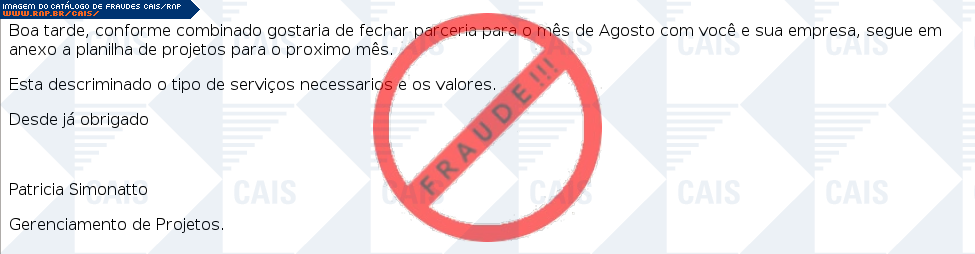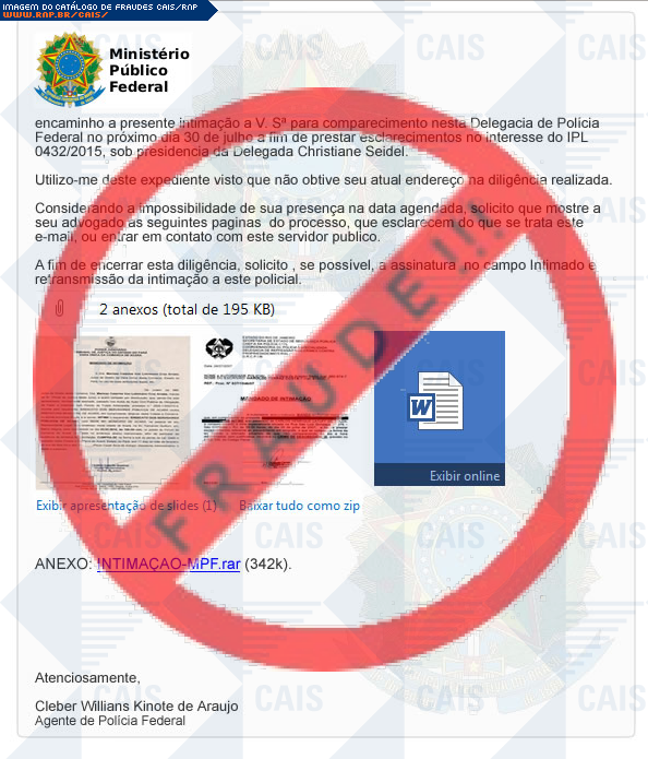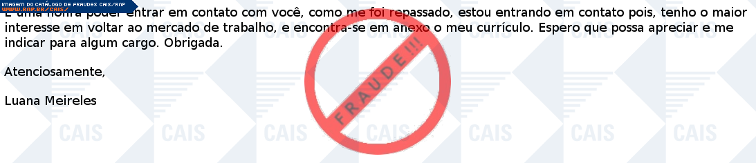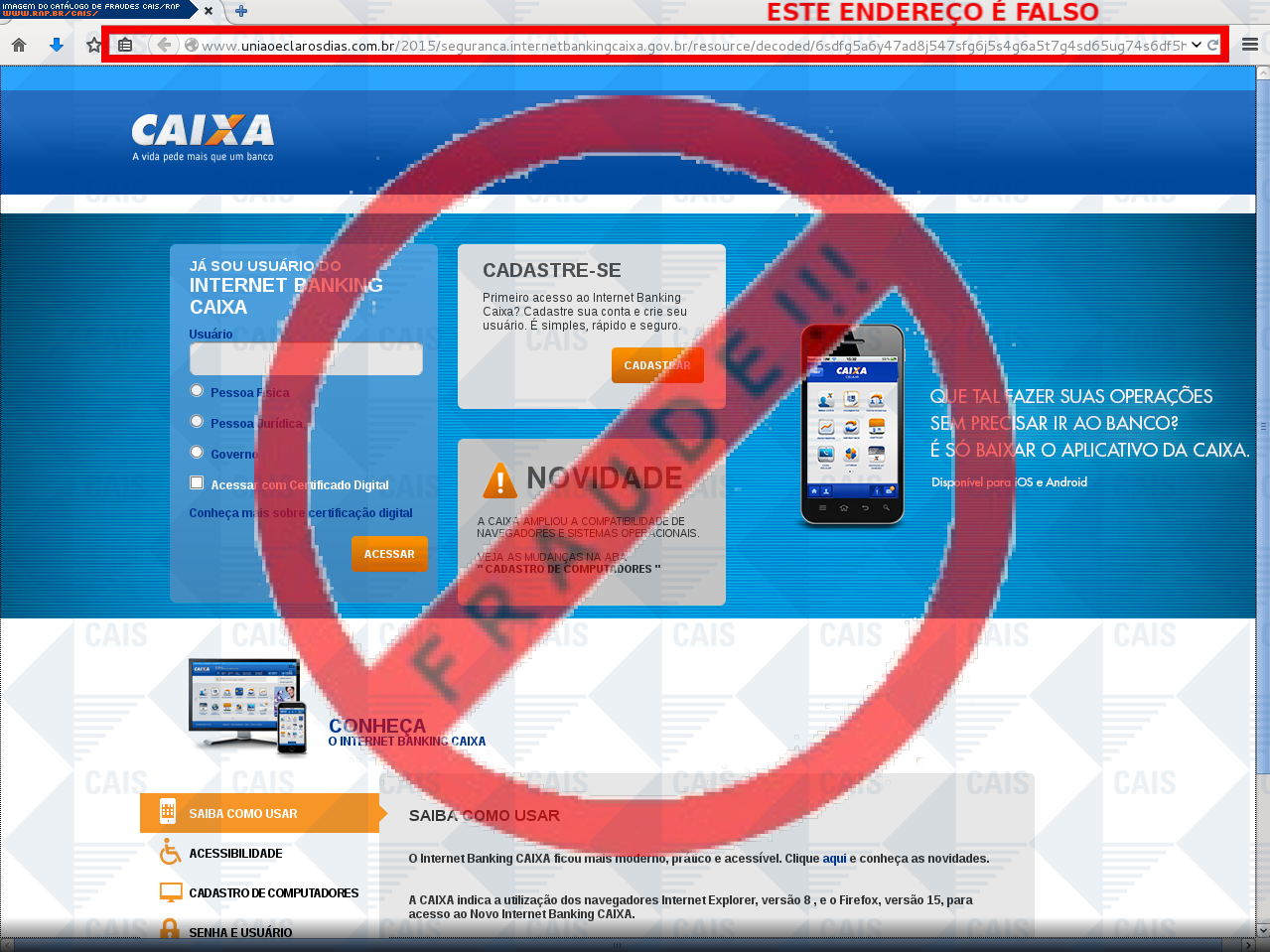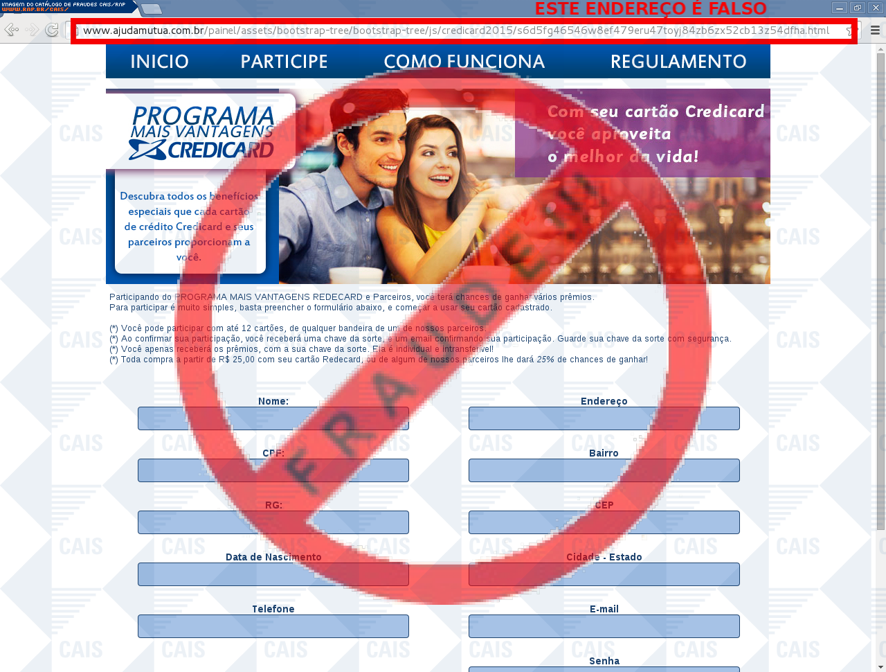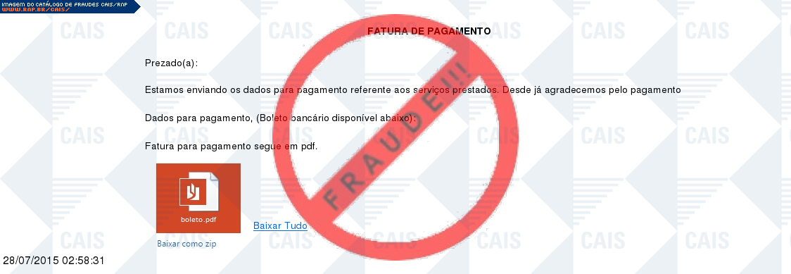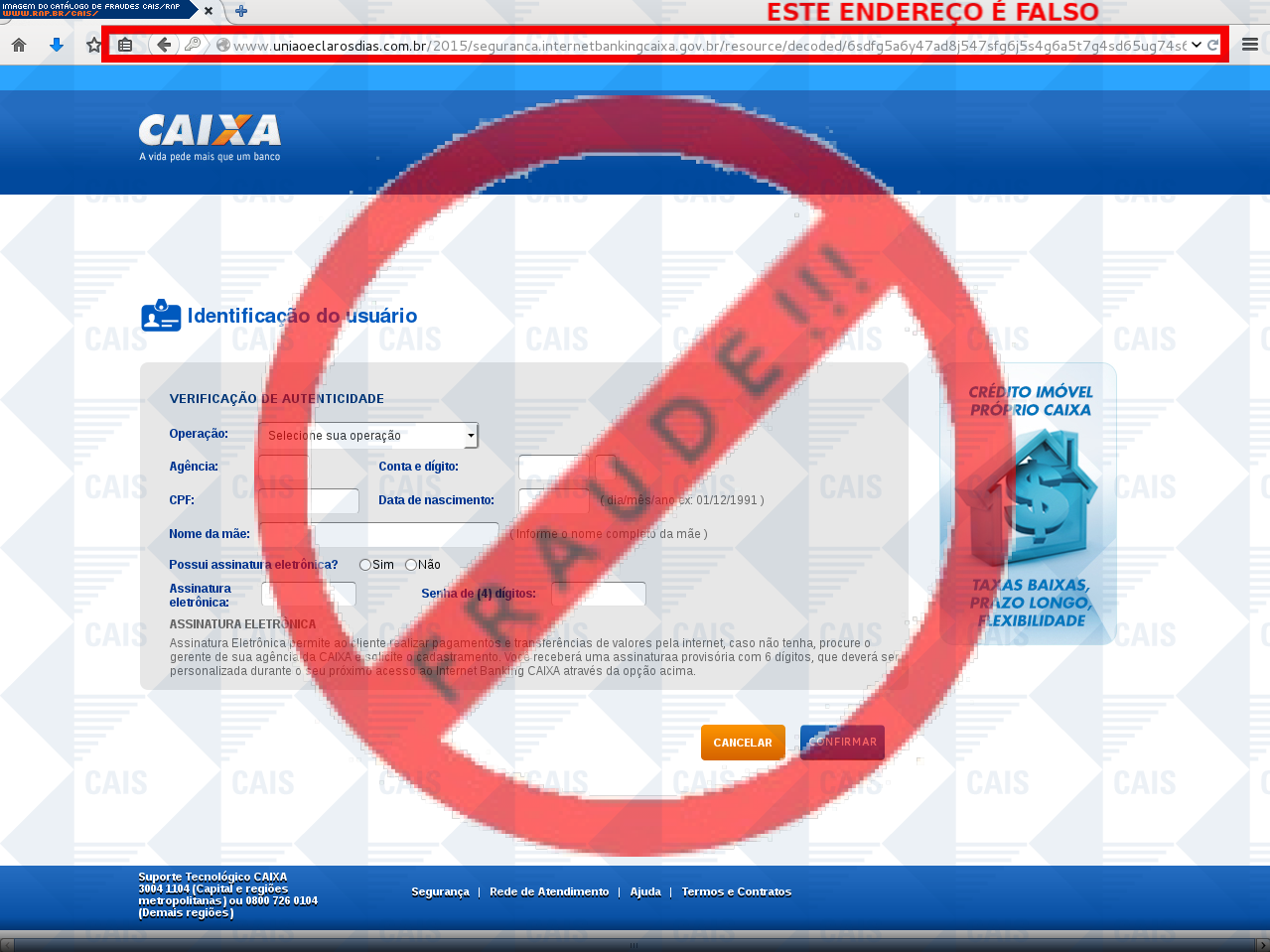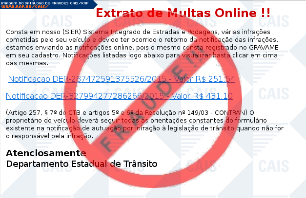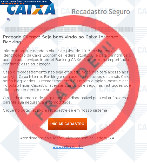 Esta página tem função informativa e educativa. Exibe uma coleção de imagens de phishing scam (fraudes eletrônicas) ou malware (código malicioso) veiculados por meio de spam (e-mail não-solicitado). Trata-se de conteúdo exemplificativo, não exaustivo, uma vez que não é possível contemplar todos os casos de fraudes existentes. Assim, caso você tenha conhecimento de um exemplar que não esteja aqui presente, isto não significa que não seja válido ou real. Inclusive incentivamos que você o envie para análise do CAIS para que, se for o caso, passe a integrar o nosso acervo.