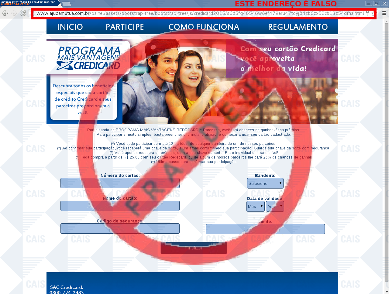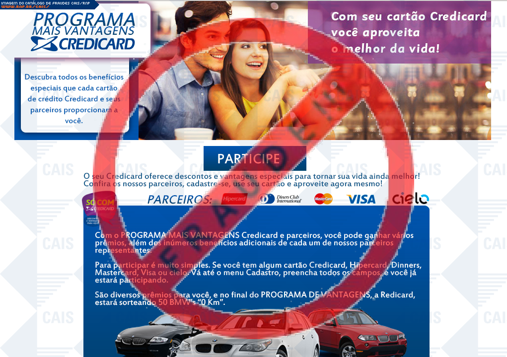 | comentário | A vítima recebe um e-mail informando sobre as vantagens da promoção Mais Vantagens do cartão Credicard sendo o cadastro através do link disponibilizado, no entanto a página é falsa criada para roubar informações do usuário. | |