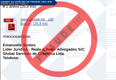 Esta página tem função informativa e educativa. Exibe uma coleção de imagens de phishing scam (fraudes eletrônicas) ou malware (código malicioso) veiculados por meio de spam (e-mail não-solicitado). Trata-se de conteúdo exemplificativo, não exaustivo, uma vez que não é possível contemplar todos os casos de fraudes existentes. Assim, caso você tenha conhecimento de um exemplar que não esteja aqui presente, isto não significa que não seja válido ou real. Inclusive incentivamos que você o envie para análise do CAIS para que, se for o caso, passe a integrar o nosso acervo.