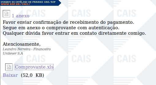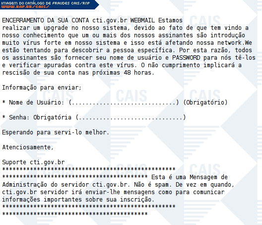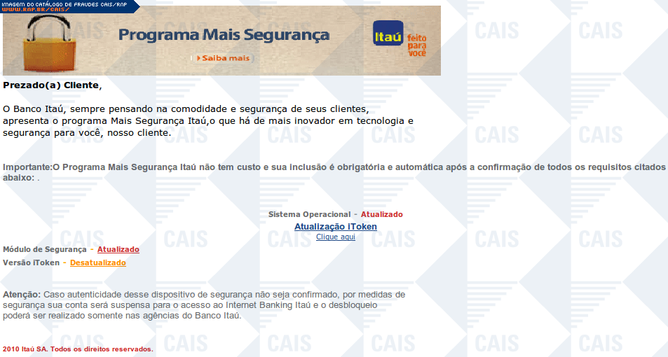Esta página tem função informativa e educativa. Exibe uma coleção de imagens de phishing scam (fraudes eletrônicas) ou malware (código malicioso) veiculados por meio de spam (e-mail não-solicitado). Trata-se de conteúdo exemplificativo, não exaustivo, uma vez que não é possível contemplar todos os casos de fraudes existentes. Assim, caso você tenha conhecimento de um exemplar que não esteja aqui presente, isto não significa que não seja válido ou real. Inclusive incentivamos que você o envie para análise do CAIS para que, se for o caso, passe a integrar o nosso acervo.