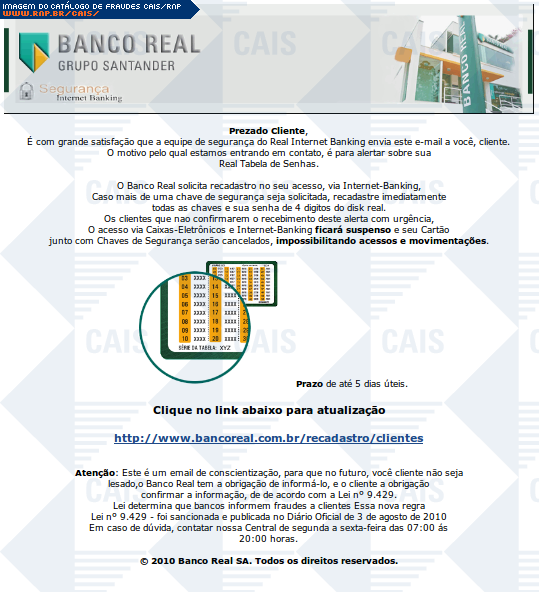 | comentário | Falso email do Banco Real que informa ao usuário que se o mesmo não cadastrar sua tabela de senhas, terá o acesso aos Caixas-Eletrônicos e Internet-Banking suspensos e o cartão cancelado. O email alicia o usuário a entrar em uma página falsa que coleta as... (leia mais) | |