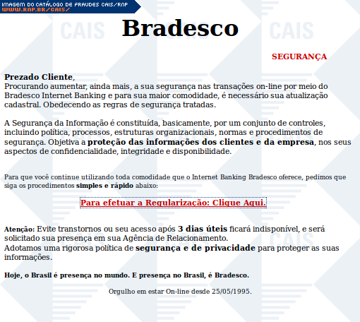 | comentário | Email falso instruindo a vítima a acessar uma suposta página do Bradesco, que na verdade coleta os dados digitados pelos usuários. Note que o endereço da página não pertence ao Banco Bradesco (ocratech.com). | |