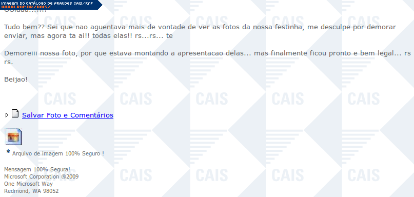 | comentário | Falso email aliciando a vítima a ver supostas fotos de uma festa, sendo que na verdade o arquivo é um malware identificado como Gen:Trojan.Heur.VP.ou0aaCMPGLT (BitDefender). | |
