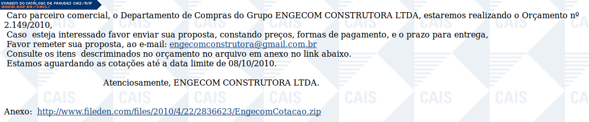 | comentário | Mensagem supostamente enviada pela empresa ENGECOM que notifica a realização de orçamento e cotação dos produtos supostamente contidos em uma lista. O link para a vizualização do anexo leva ao download de um arquivo malicioso identificado como Trojan-Dropper.Win32.Agent.dezy... (leia mais) | |