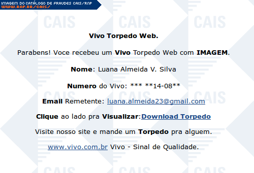 | comentário | Fraude que se passa pela empresa VIVO informando a vítima sobre o recebimento de um Torpedo Web com imagem enviado por Luana Almeida V. Silva. A mensagem contém um link para o download do torpedo. Tal link leva a um software malicioso que foi identificado... (leia mais) | |