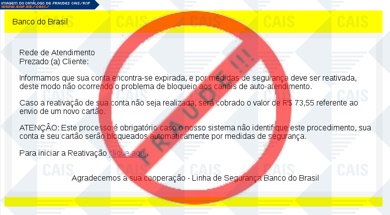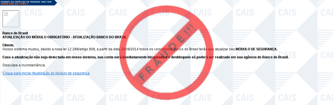 Esta página tem função informativa e educativa. Exibe uma coleção de imagens de phishing scam (fraudes eletrônicas) ou malware (código malicioso) veiculados por meio de spam (e-mail não-solicitado). Trata-se de conteúdo exemplificativo, não exaustivo, uma vez que não é possível contemplar todos os casos de fraudes existentes. Assim, caso você tenha conhecimento de um exemplar que não esteja aqui presente, isto não significa que não seja válido ou real. Inclusive incentivamos que você o envie para análise do CAIS para que, se for o caso, passe a integrar o nosso acervo.