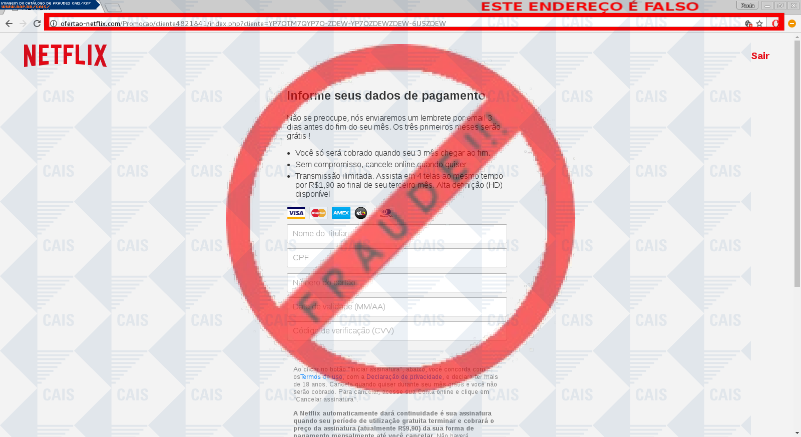 | comentário | A vítima recebe uma mensagem informando sobre promoção do serviço de streaming Netflix no link disponibilizado, no entanto a página é falsa destinada a roubar as informações do usuário. | |