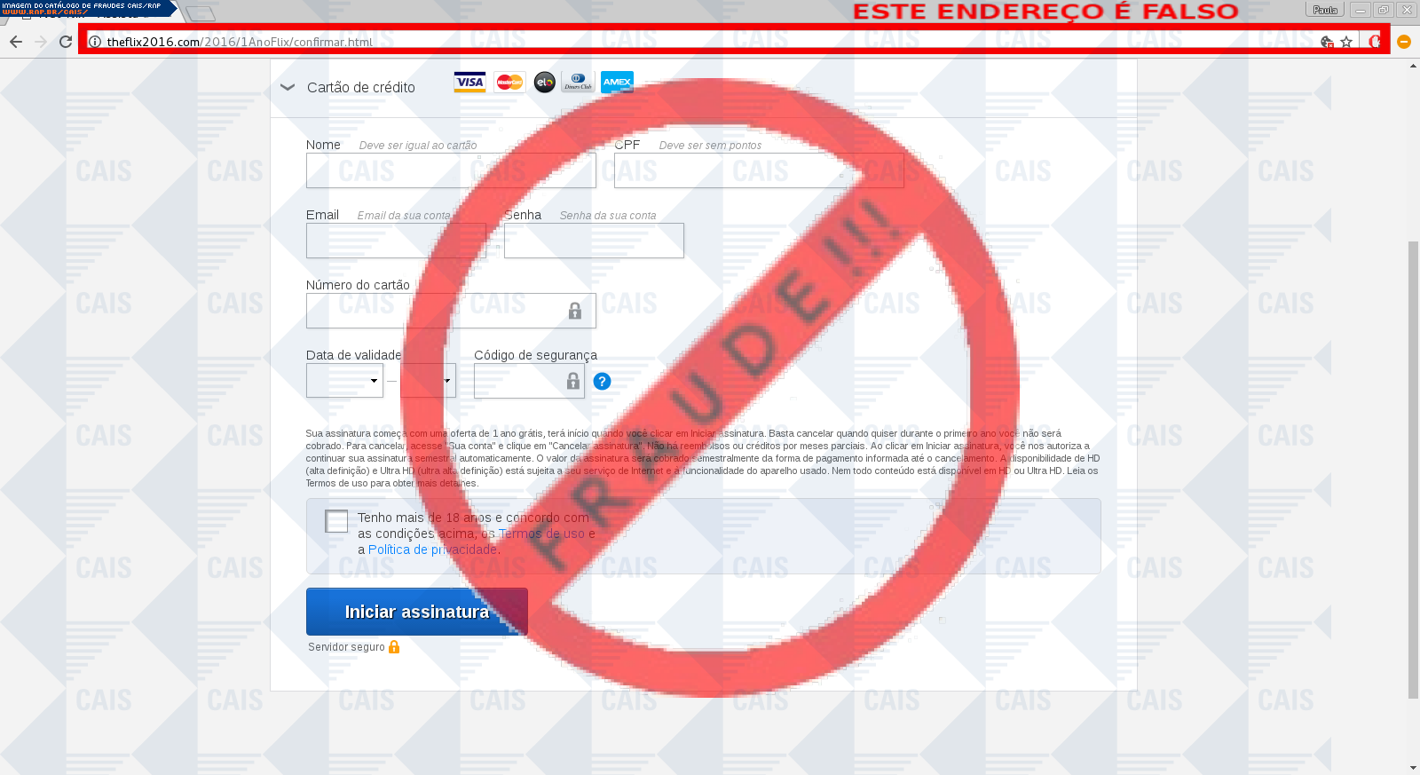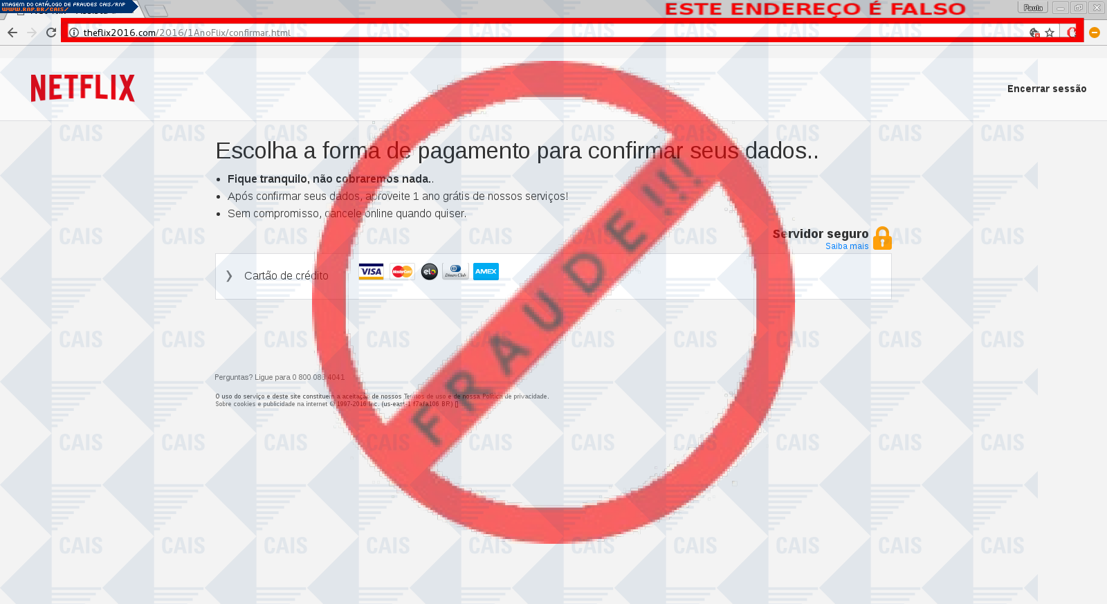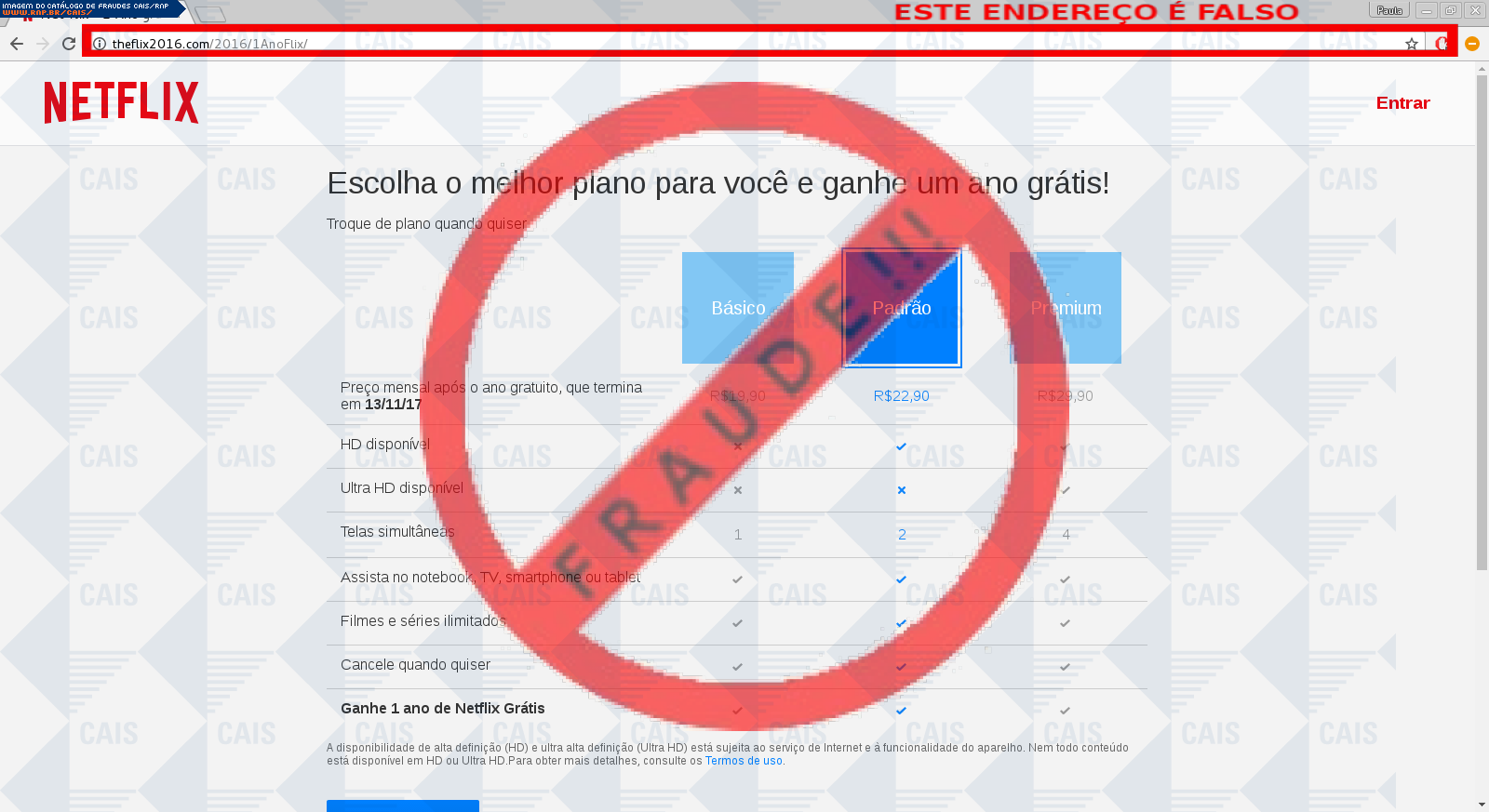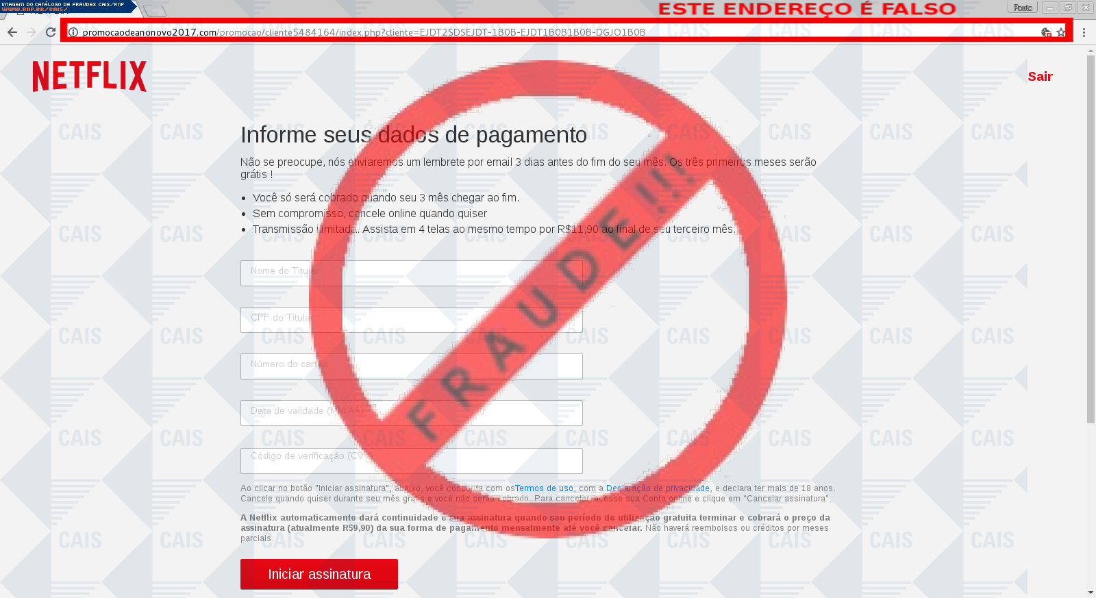 | comentário | A vítima recebe uma mensagem informando que há uma promoção de um ano grátis do serviço Netflix sendo necessário realizar cadastro no link disponibilizado, no entanto a página é falsa destinada a roubar as informações do usuário. | |