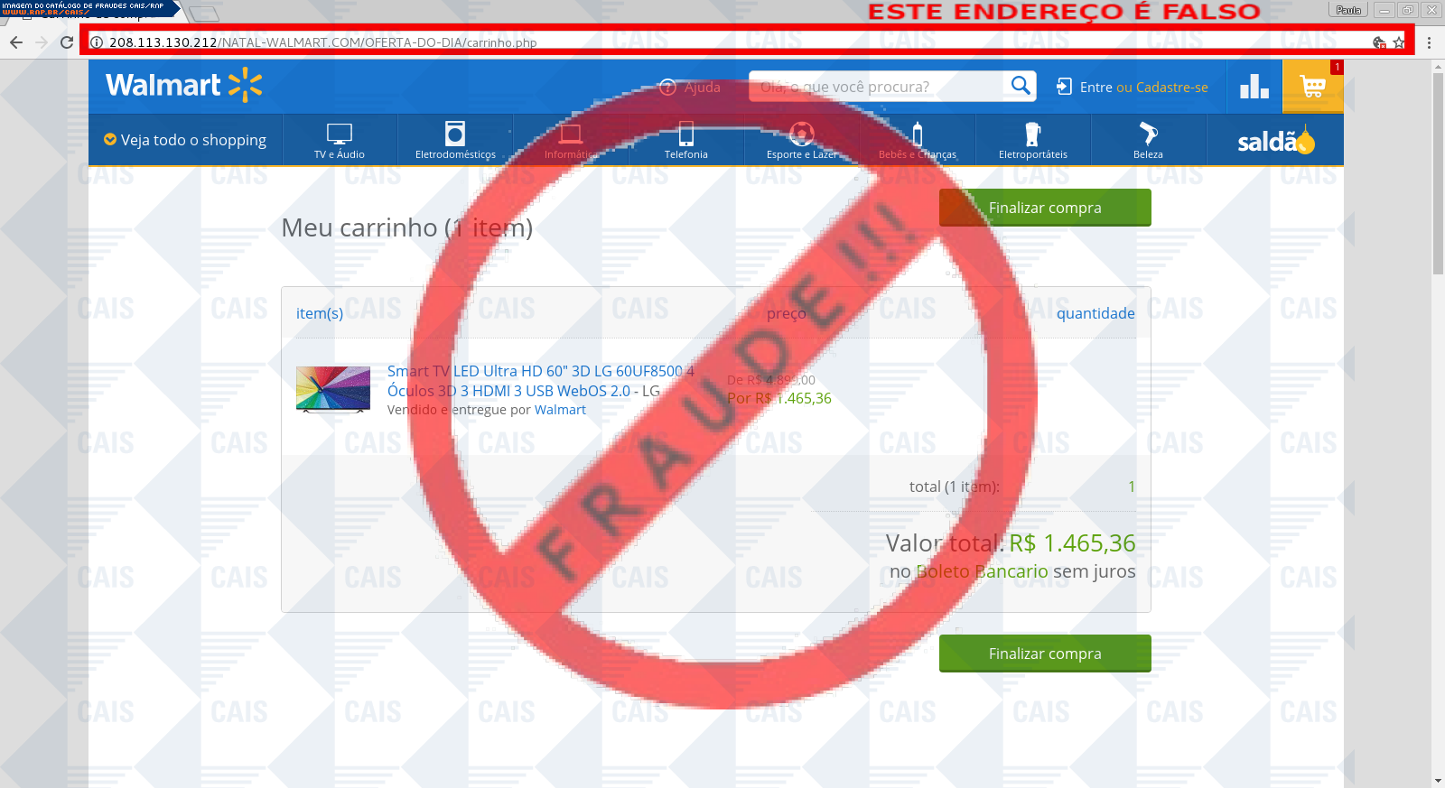 | comentário | A vítima recebe um e-mail informando sobre promoções no site de compra da loja Walmart disponibilizando link de vários produtos em desconto, no entanto a página é falsa destinada a roubar as informações pessoais e do cartão de crédito/débito do usuário. | |