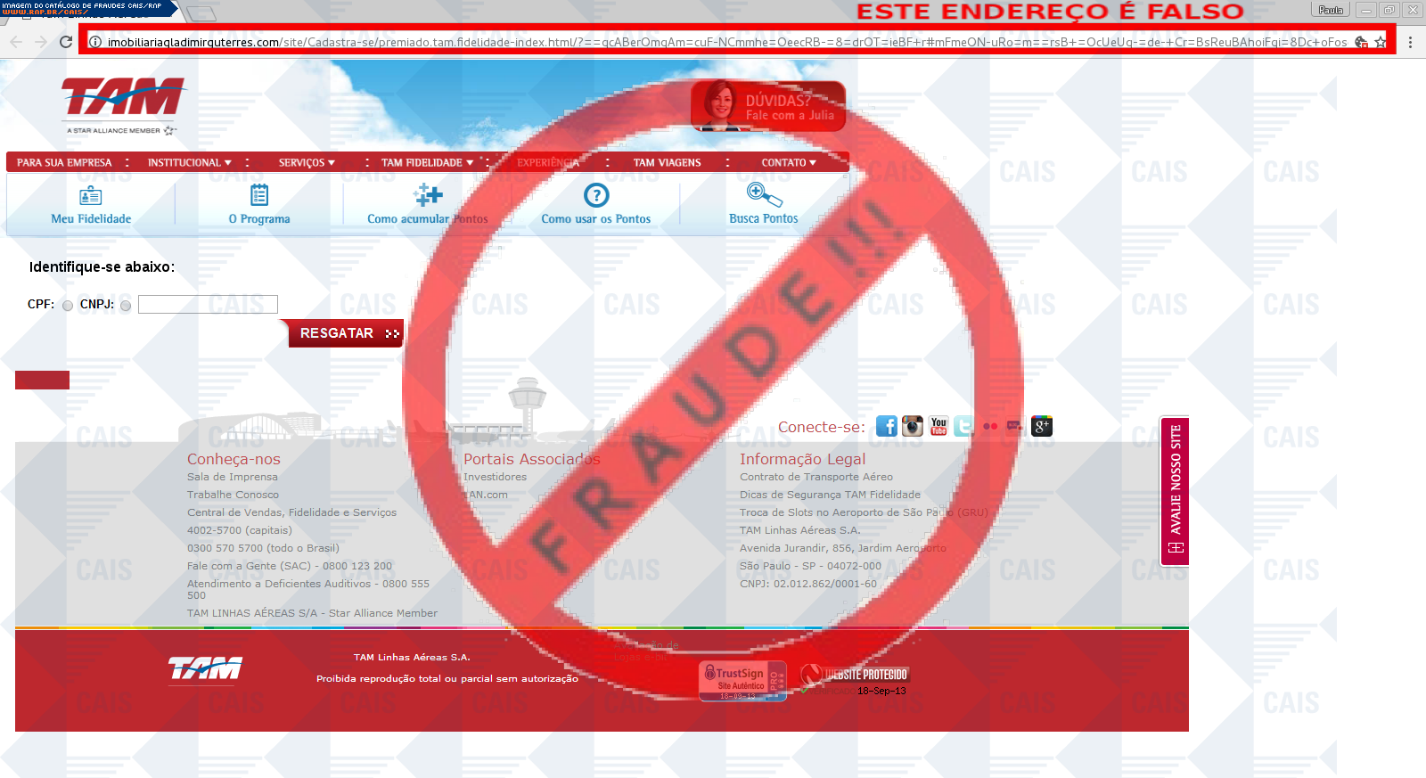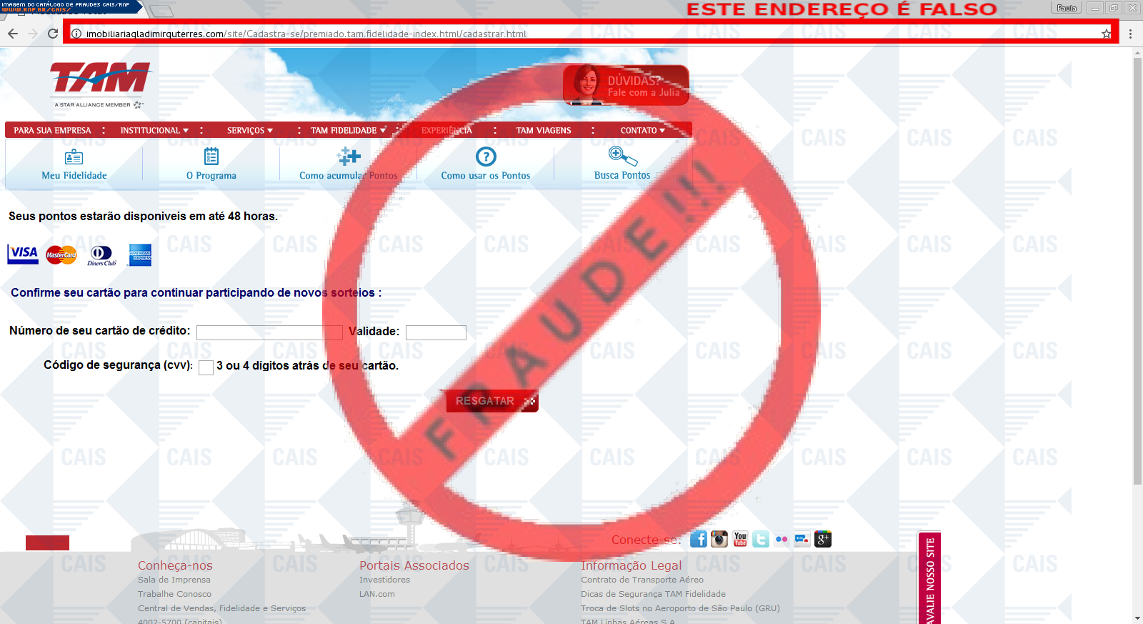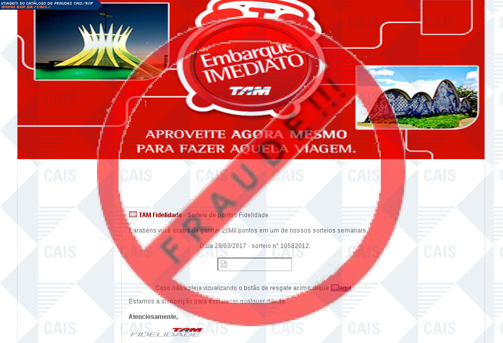 | comentário | A vítima recebe uma mensagem informando sobre promoção na empresa aérea Tam sendo necessário realizar cadastro no link disponibilizado, no entanto a página é falsa destinada a roubar as informações do usuário. | |