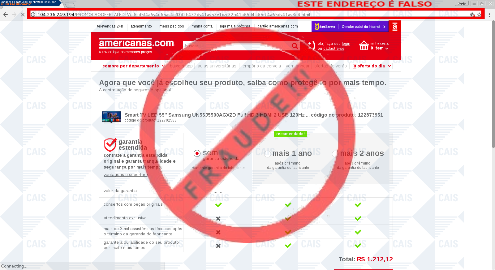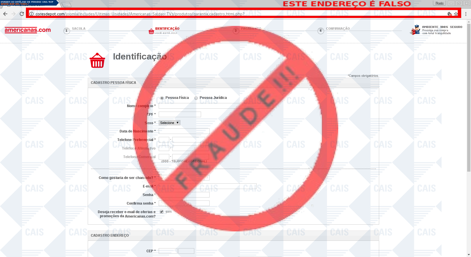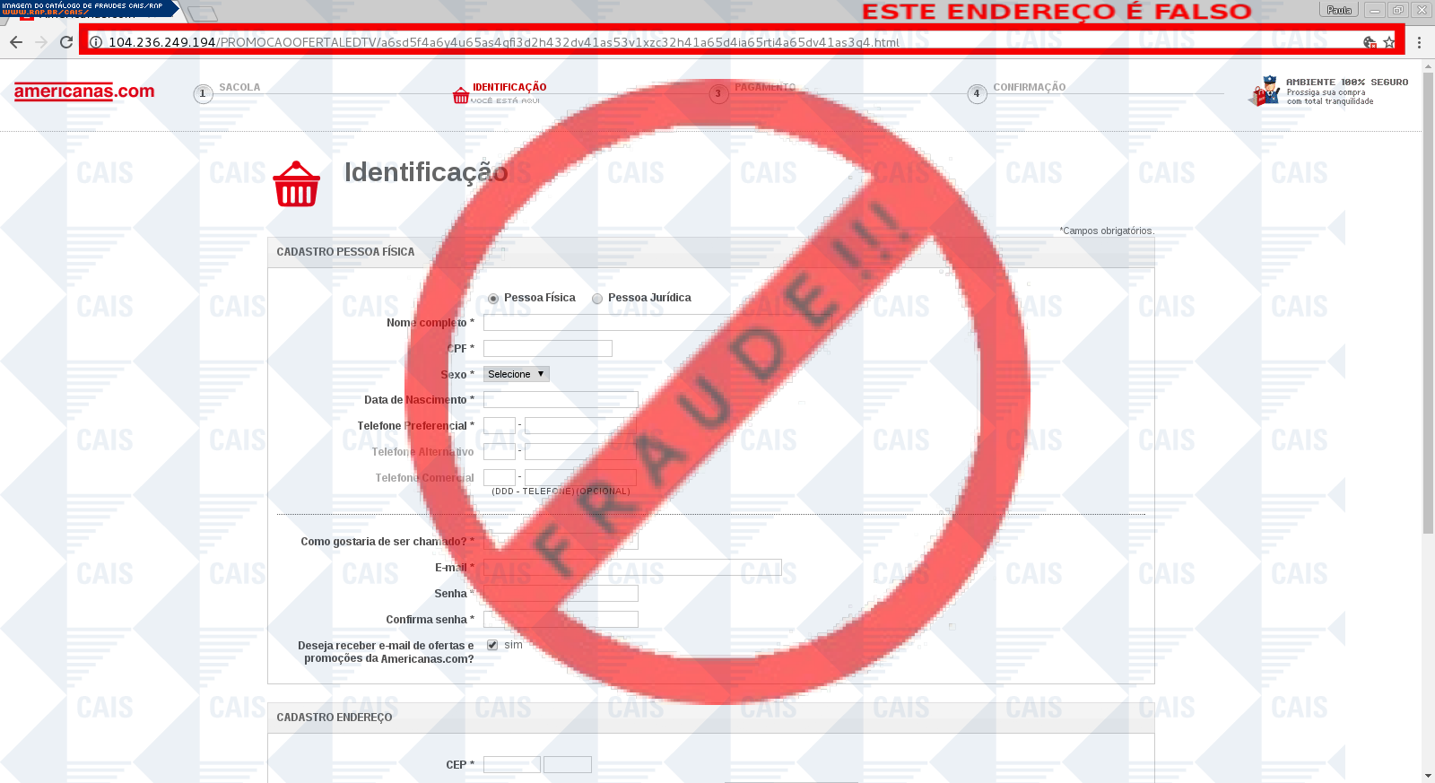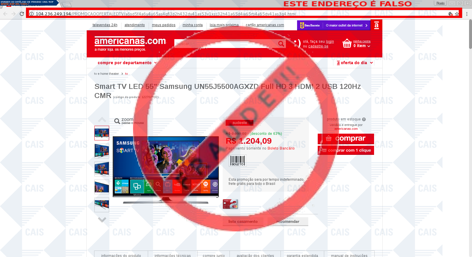 | comentário | A vítima recebe um e-mail informando sobre promoções no site de compra da Lojas Americanas disponibilizando link de desconto em TV Digital, no entanto a página é falsa destinada a roubar as informações pessoais e do cartão de crédito/débito do usuário. | |