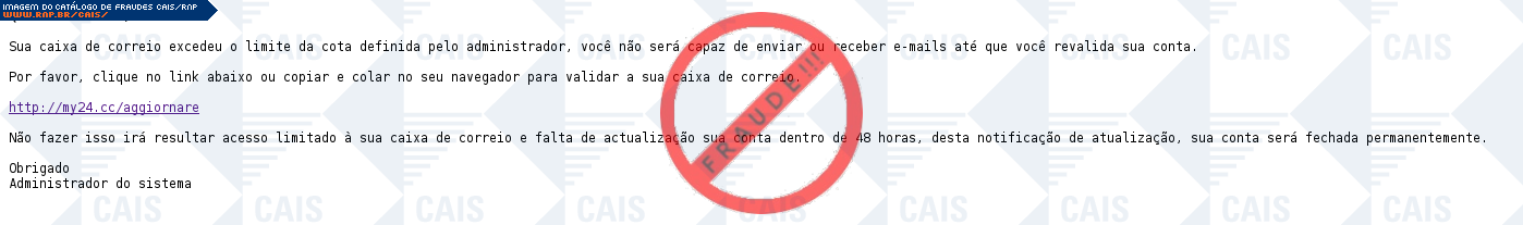 | comentário | O usuário recebe uma mensagem informando que a cota de sua conta de e-mail atingiu o limite sendo necessário uma atualização no link disponibilizado, entretanto a página é falsa criada para roubar os dados do e-mail da vítima. | |