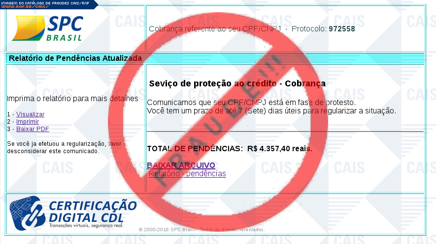 | comentário | O usuário recebe uma mensagem contendo uma cobrança referente ao protesto de CPF/CNPJ disponível para download, no entanto o arquivo originado é malicioso criado para roubar informações da vítima e instalar outros arquivos fraudulentos. | |