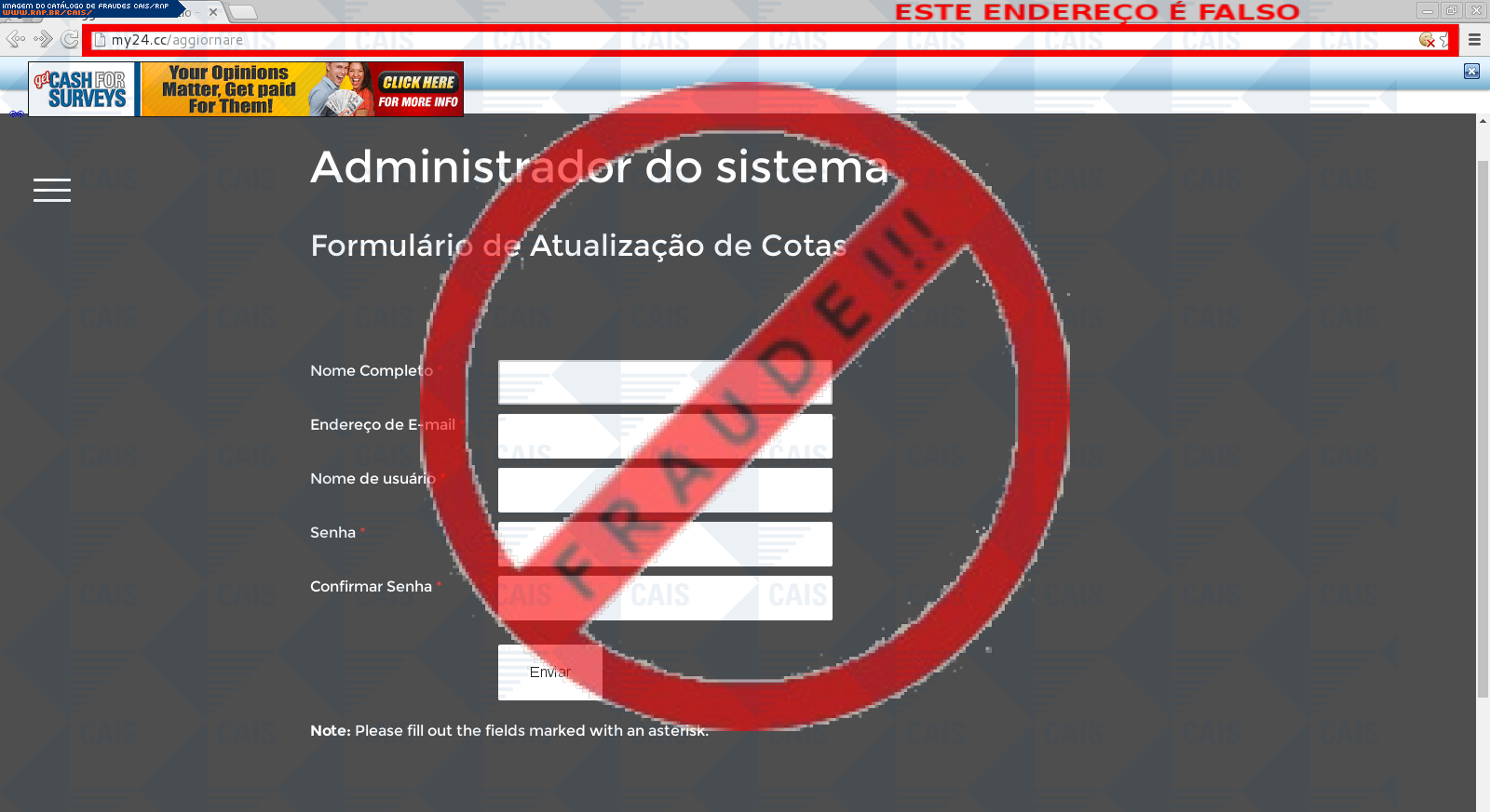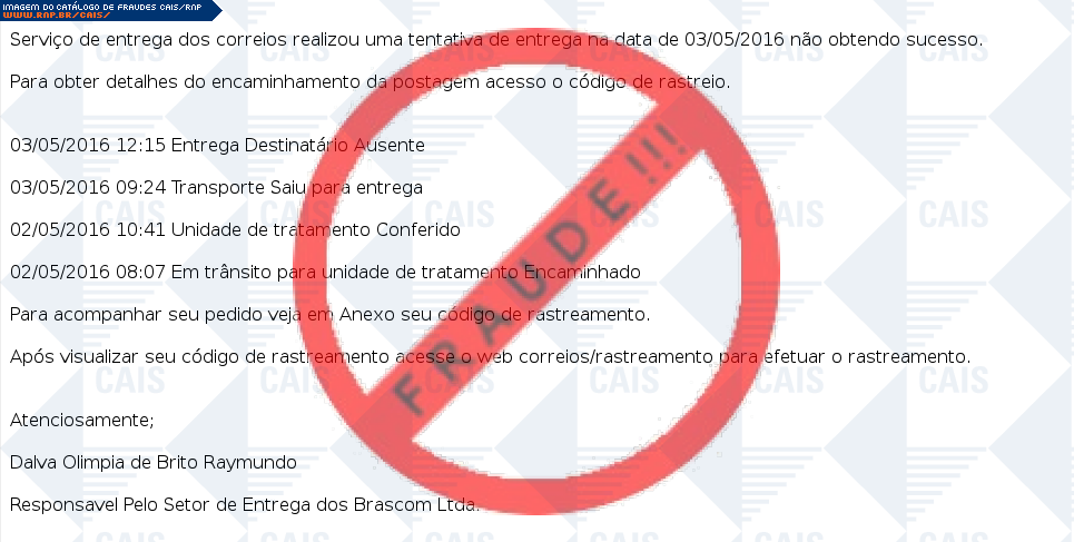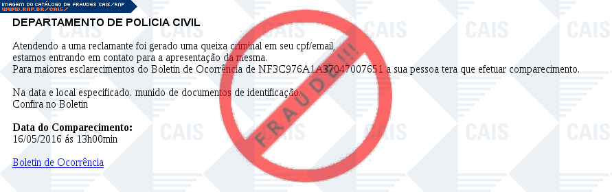 Esta página tem função informativa e educativa. Exibe uma coleção de imagens de phishing scam (fraudes eletrônicas) ou malware (código malicioso) veiculados por meio de spam (e-mail não-solicitado). Trata-se de conteúdo exemplificativo, não exaustivo, uma vez que não é possível contemplar todos os casos de fraudes existentes. Assim, caso você tenha conhecimento de um exemplar que não esteja aqui presente, isto não significa que não seja válido ou real. Inclusive incentivamos que você o envie para análise do CAIS para que, se for o caso, passe a integrar o nosso acervo.