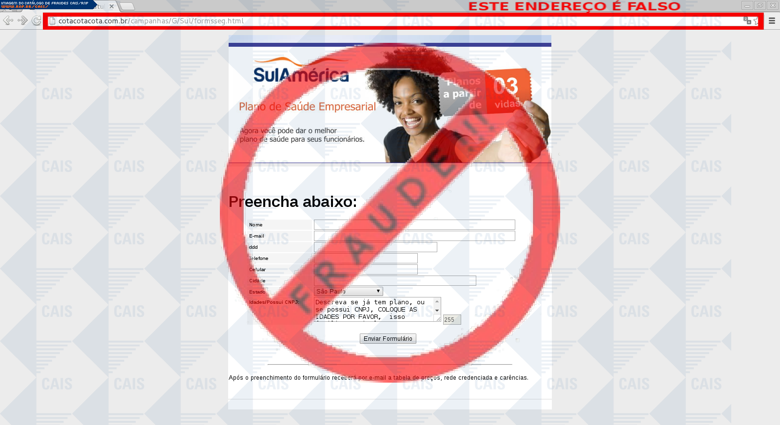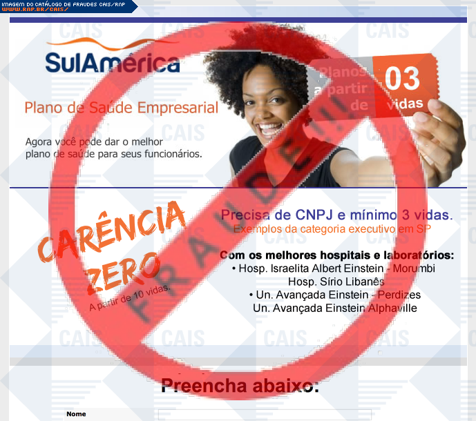 | comentário | A vítima recebe uma mensagem informando sobre oferta de plano de saúde da SulAmérica com link para formulário web, no entanto a página é falsa destinada a roubar as informações do usuário. | |