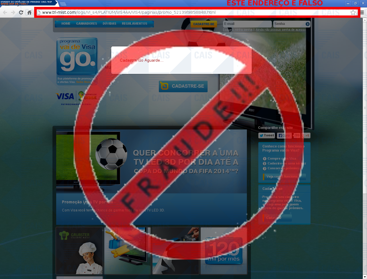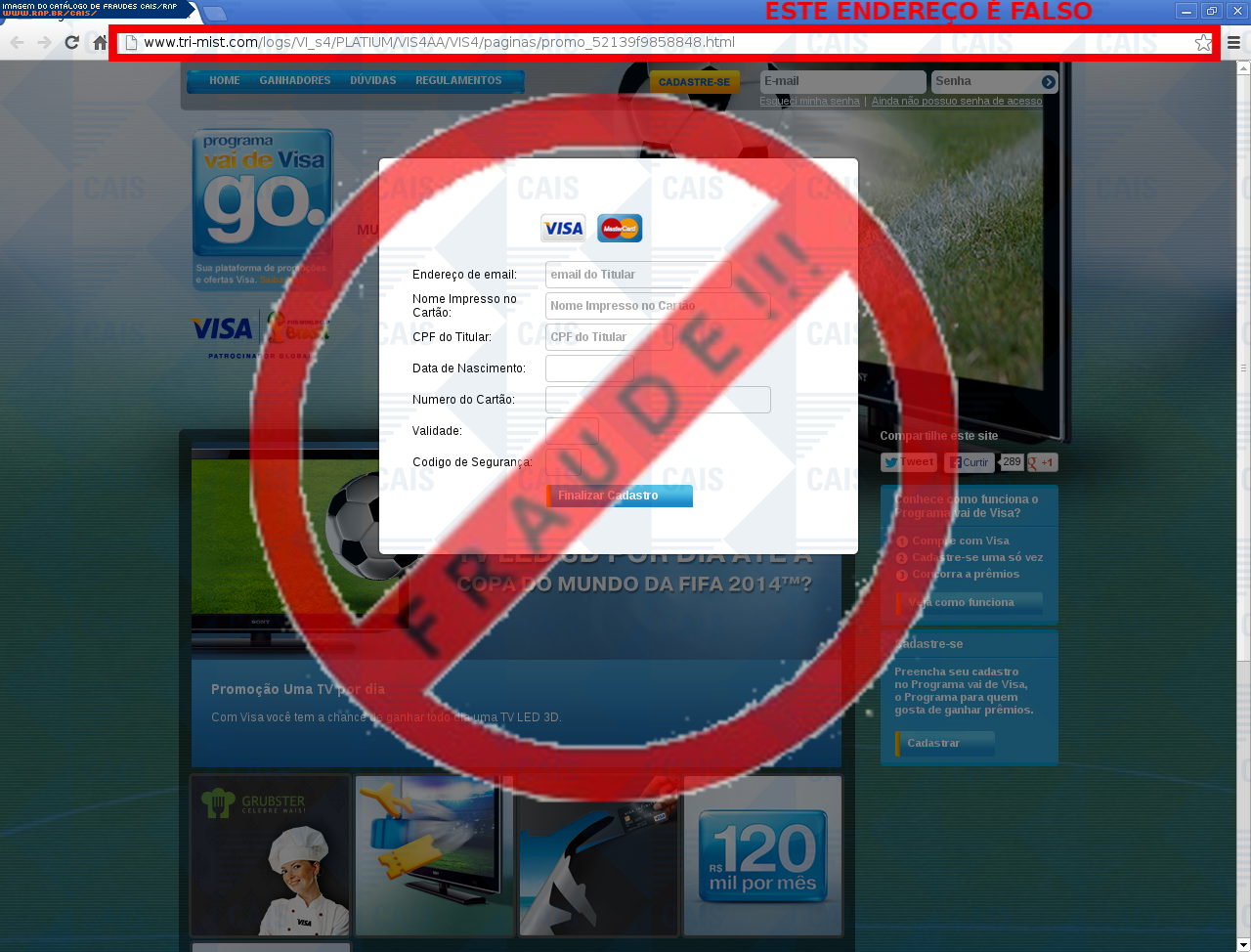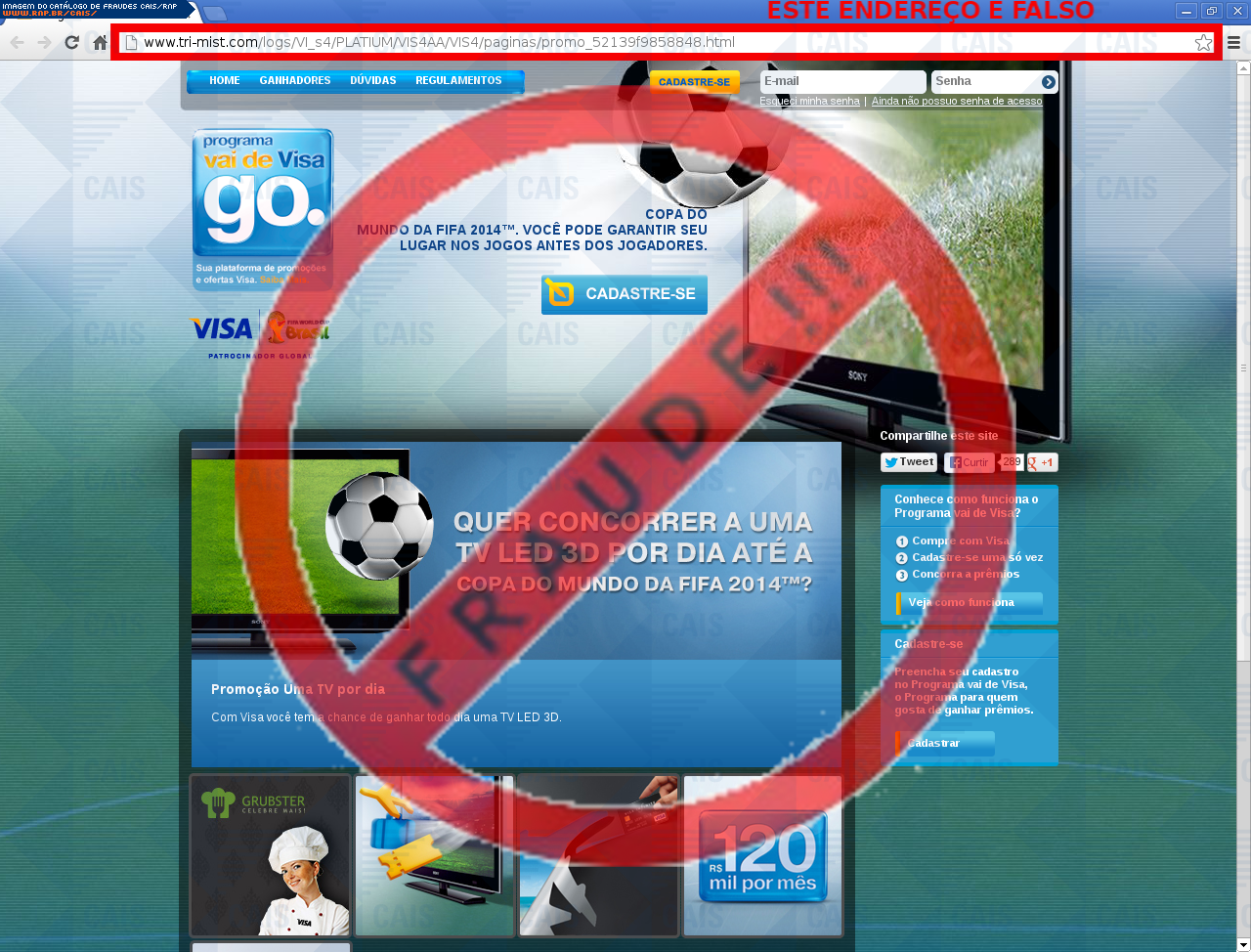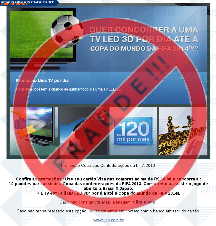 | comentário | O usuário recebe uma mensagem sobre uma promoção relacionada a Copa das Confederações, mas quando acessa o link é levado a um site falso usado na prática de phishing. | |