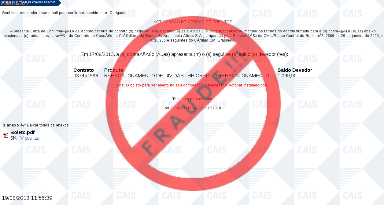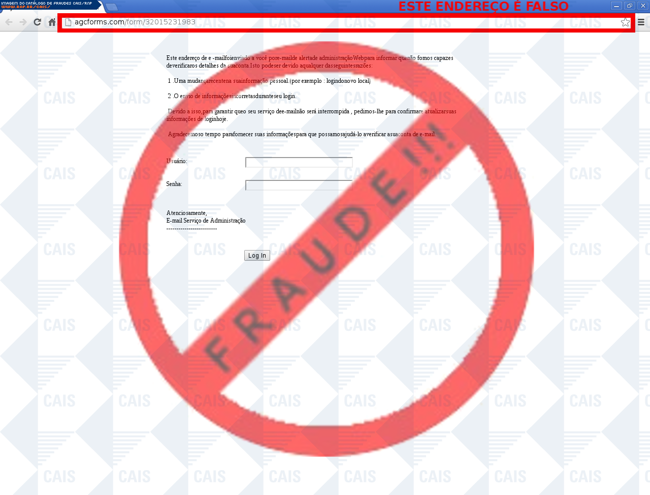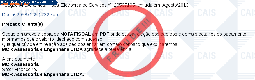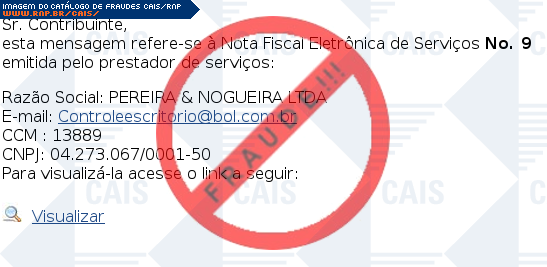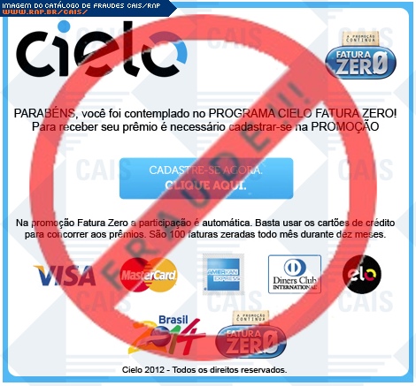 Esta página tem função informativa e educativa. Exibe uma coleção de imagens de phishing scam (fraudes eletrônicas) ou malware (código malicioso) veiculados por meio de spam (e-mail não-solicitado). Trata-se de conteúdo exemplificativo, não exaustivo, uma vez que não é possível contemplar todos os casos de fraudes existentes. Assim, caso você tenha conhecimento de um exemplar que não esteja aqui presente, isto não significa que não seja válido ou real. Inclusive incentivamos que você o envie para análise do CAIS para que, se for o caso, passe a integrar o nosso acervo.