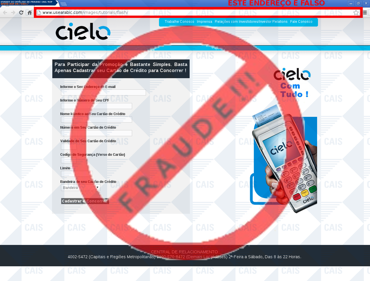 | comentário | Uma mensagem é enviada contendo um informativo de promoção, mas quando o usuário acessa o link para cadastro é levado para uma pagina falsa que solicita dados do seu cartão de credito. | |