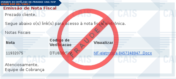 | comentário | O fraudador envia uma mensagem contendo uma suposta nota fiscal eletrônica, mas quando o usuário acessa o site é feito o download de um software malicioso. | |