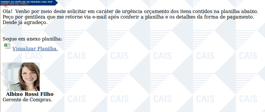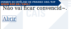 Esta página tem função informativa e educativa. Exibe uma coleção de imagens de phishing scam (fraudes eletrônicas) ou malware (código malicioso) veiculados por meio de spam (e-mail não-solicitado). Trata-se de conteúdo exemplificativo, não exaustivo, uma vez que não é possível contemplar todos os casos de fraudes existentes. Assim, caso você tenha conhecimento de um exemplar que não esteja aqui presente, isto não significa que não seja válido ou real. Inclusive incentivamos que você o envie para análise do CAIS para que, se for o caso, passe a integrar o nosso acervo.