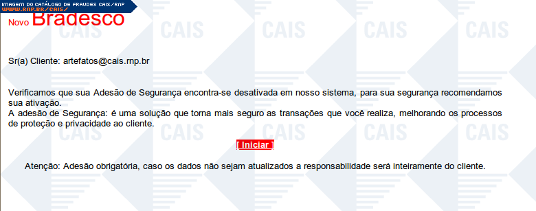 | comentário | Comunicado falso do banco Bradesco informando que a vítima deve realizar a adesão de segurança. A fraude contém um link que leva a uma página falsa, destinada a roubar dados da conta bancária da vítima. | |