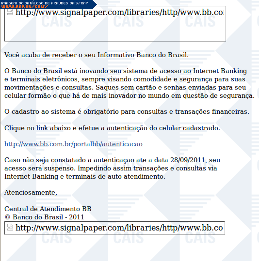 | comentário | A fraude contém um link que leva a uma página que supostamente serviria para atualizar os dados da vítima no banco. O link foi classificado como Phishing site (Websense ThreatSeeker). | |
