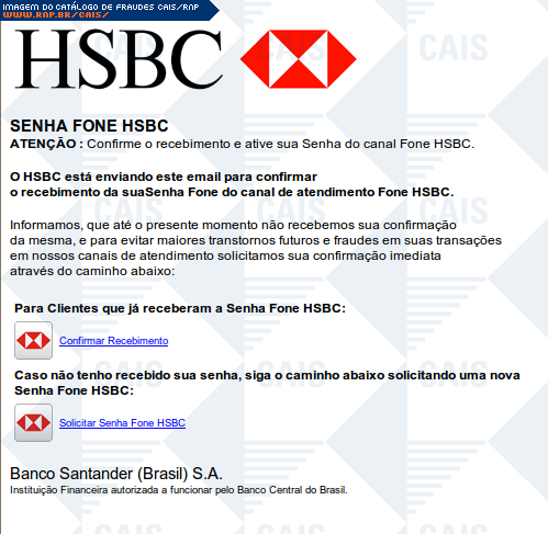 | comentário | A mensagem, em nome do banco HSBC, informa que a vítima deve confirmar o recebimento da sua Senha Fone. A fraude contém um link que leva a um site falso, destinado a roubar dados da conta bancária da vítima. | |
