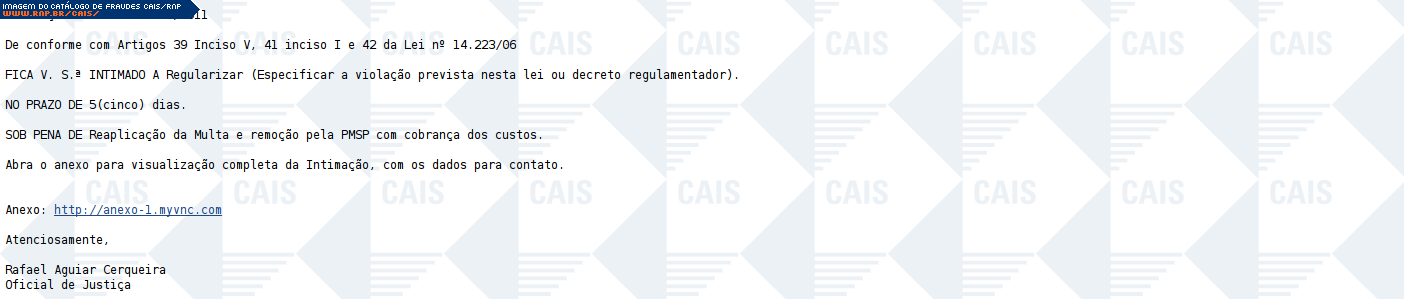 | comentário | A fraude contém um link que realiza suposto download de um provável arquivo malicioso. Tal arquivo já não estava disponível no momento da análise. | |