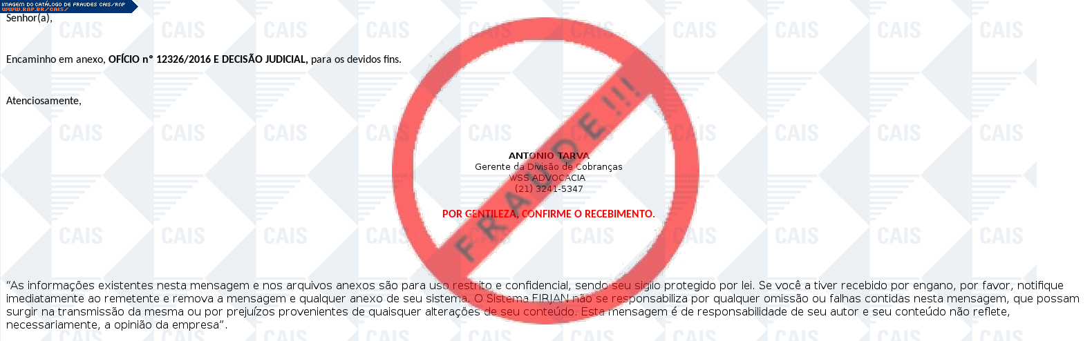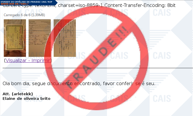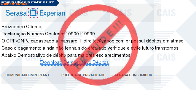 Esta página tem função informativa e educativa. Exibe uma coleção de imagens de phishing scam (fraudes eletrônicas) ou malware (código malicioso) veiculados por meio de spam (e-mail não-solicitado). Trata-se de conteúdo exemplificativo, não exaustivo, uma vez que não é possível contemplar todos os casos de fraudes existentes. Assim, caso você tenha conhecimento de um exemplar que não esteja aqui presente, isto não significa que não seja válido ou real. Inclusive incentivamos que você o envie para análise do CAIS para que, se for o caso, passe a integrar o nosso acervo.