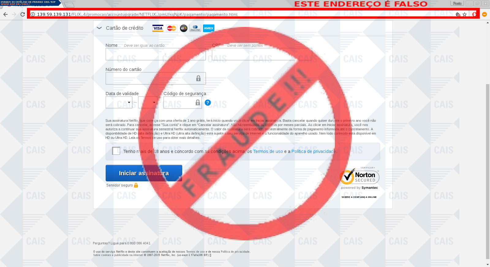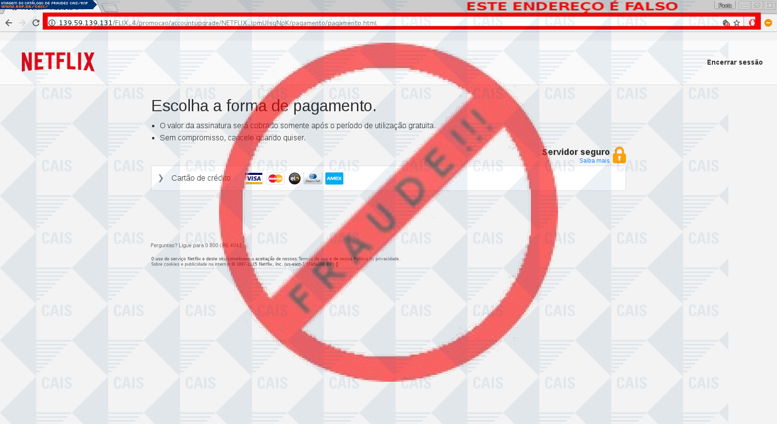 | comentário | A vítima recebe uma mensagem informando que ganhou um ano do serviço de filmes Netflix sendo necessário realizar cadastro no link disponibilizado, no entanto a página é falsa destinada a roubar as informações do usuário. | |