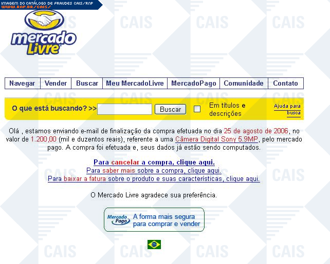 | comentário | Fraude que utiliza o nome do site de leilões MercadoLivre informando sobre a compra de uma camera digital em 25 de agosto de 2006. O link atrelado a mensagem faz o download do arquivo malicioso diversos.scr | |