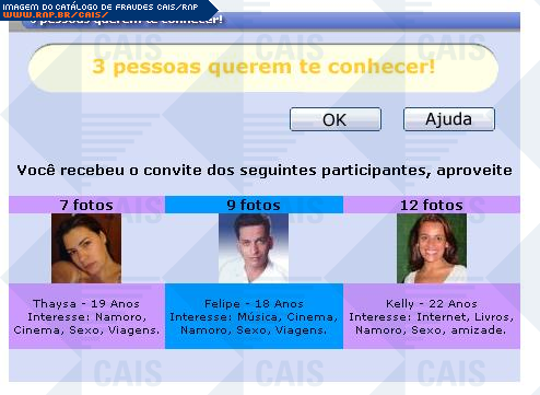 | comentário | Fraude que informa sobre 3 pessoas que querem conhecer você. Típica fraude impessoal. Os três links da mensagem apontam para o mesmo arquivo malicioso, perfil.exe. A mensagem não informa o nome do site de relacionamento, apenas induz a vítima a clicar nos... (leia mais) | |