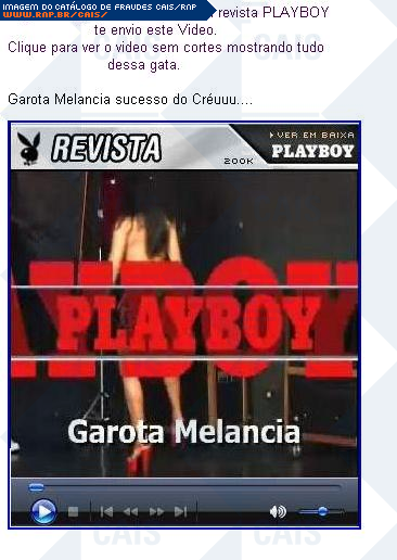 | comentário | Fraude que utiliza o nome da revista Playboy anunciando um vídeo com a Mulher(?) Garota(?) Melancia. O arquivo atrelado, Video.Playboy.com, foi identificado por antivirus como Trojan.Downloader.Banload-4568 | |