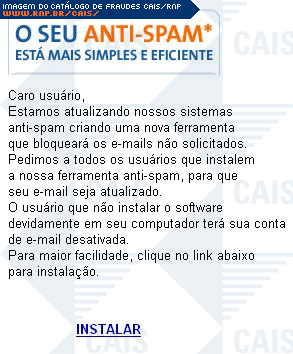Esta página tem função informativa e educativa. Exibe uma coleção de imagens de phishing scam (fraudes eletrônicas) ou malware (código malicioso) veiculados por meio de spam (e-mail não-solicitado). Trata-se de conteúdo exemplificativo, não exaustivo, uma vez que não é possível contemplar todos os casos de fraudes existentes. Assim, caso você tenha conhecimento de um exemplar que não esteja aqui presente, isto não significa que não seja válido ou real. Inclusive incentivamos que você o envie para análise do CAIS para que, se for o caso, passe a integrar o nosso acervo.