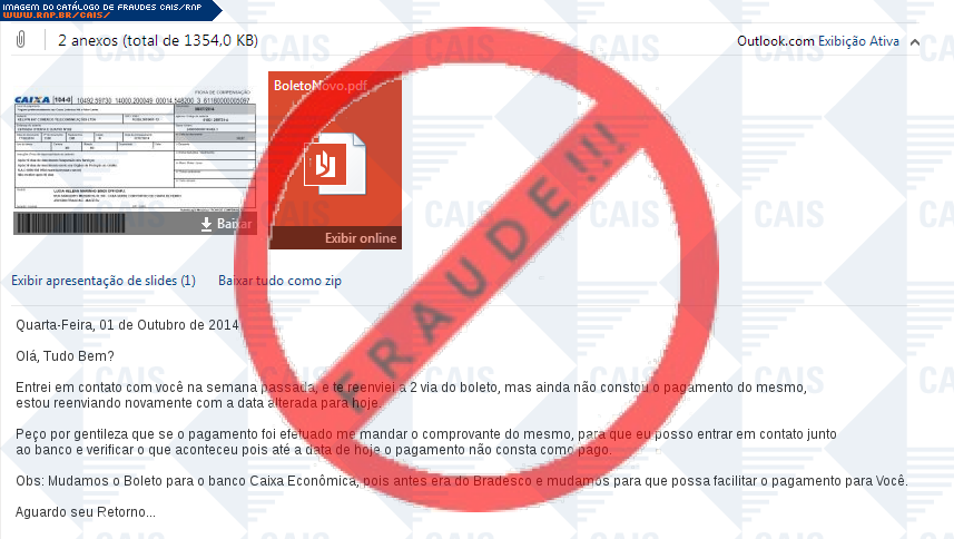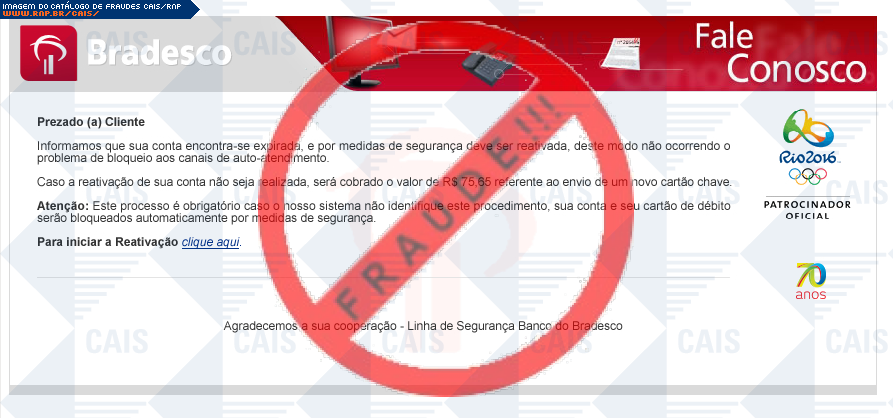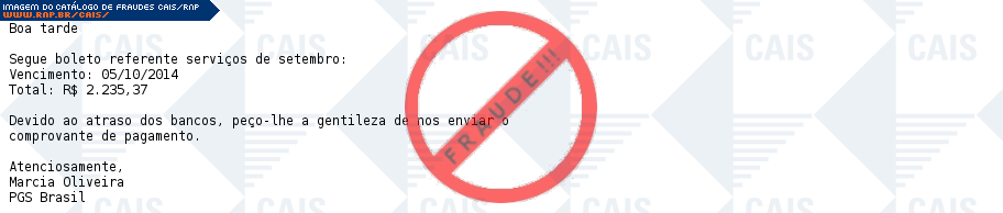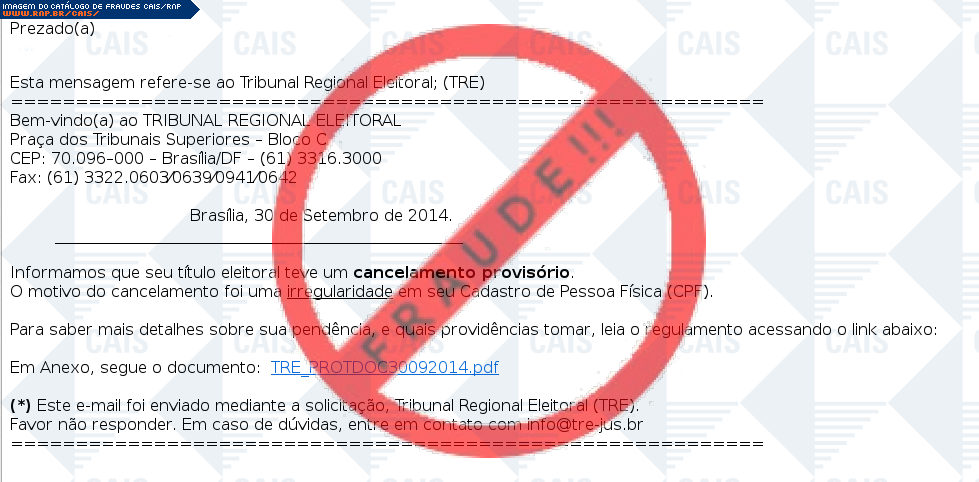 Esta página tem função informativa e educativa. Exibe uma coleção de imagens de phishing scam (fraudes eletrônicas) ou malware (código malicioso) veiculados por meio de spam (e-mail não-solicitado). Trata-se de conteúdo exemplificativo, não exaustivo, uma vez que não é possível contemplar todos os casos de fraudes existentes. Assim, caso você tenha conhecimento de um exemplar que não esteja aqui presente, isto não significa que não seja válido ou real. Inclusive incentivamos que você o envie para análise do CAIS para que, se for o caso, passe a integrar o nosso acervo.