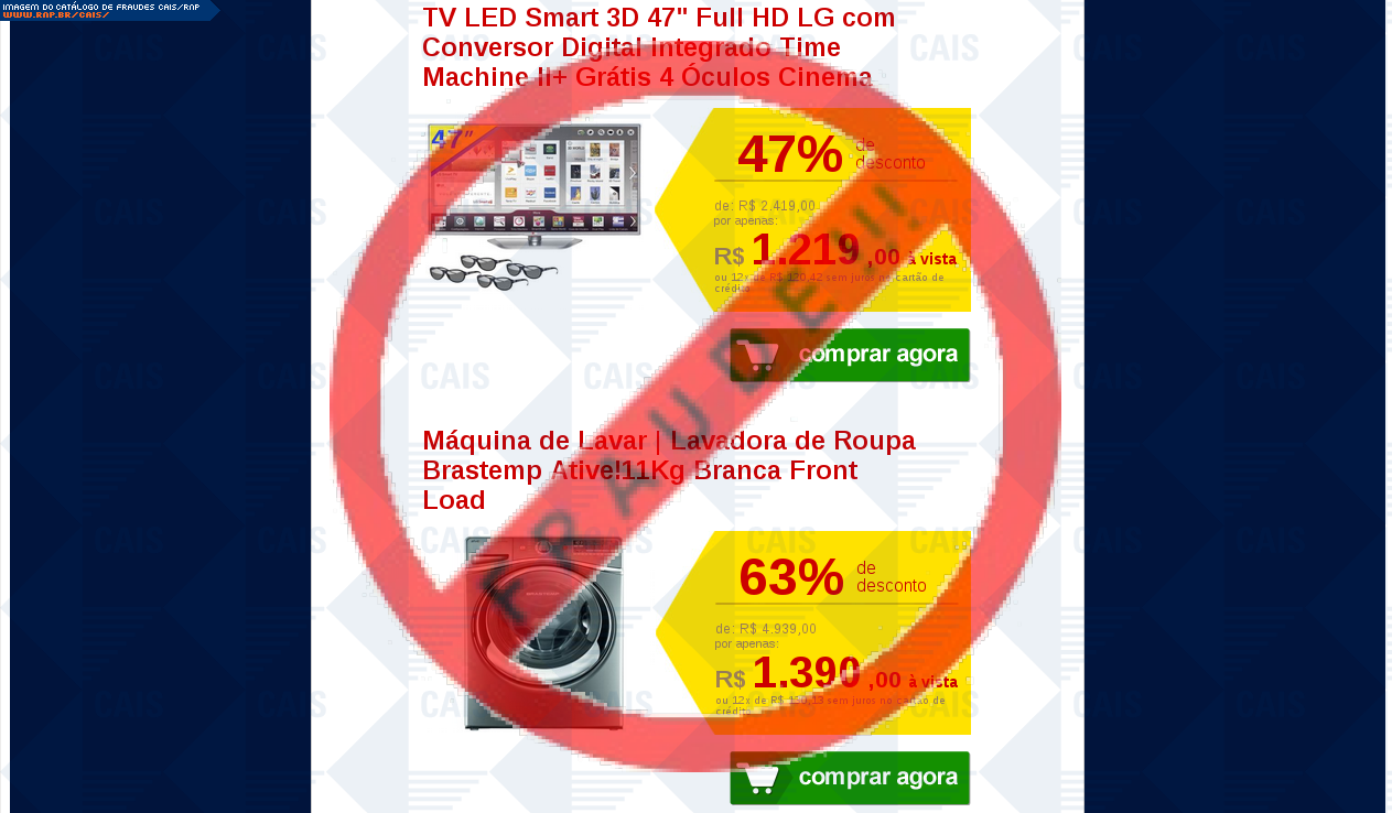 |   |  Fraudes identificadas e divulgadas pelo CAISA partir de 2008, todas as fraudes identificadas pelo CAIS estão sendo ordenadas de acordo com a data de distribuição e disponibilizadas para consulta, com o intuito de conscientizar a comunidade sobre os principais golpes que estão em circulação. Adicionalmente, o CAIS envia alertas de segurança através da lista CAIS Alerta quando uma fraude mostra-se particularmente perigosa aos usuários de computadores. Reporte fraudes: