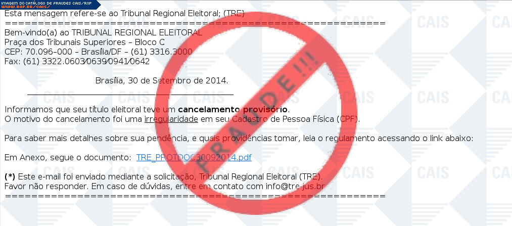 | comentário | O usuário recebe uma mensagem informando que seu título de eleitor foi temporariamente cancelado estando maiores informações em um arquivo disponível para download, no entanto o arquivo originado é malicioso criado para roubar informações da vítima e instalar... (leia mais) | |