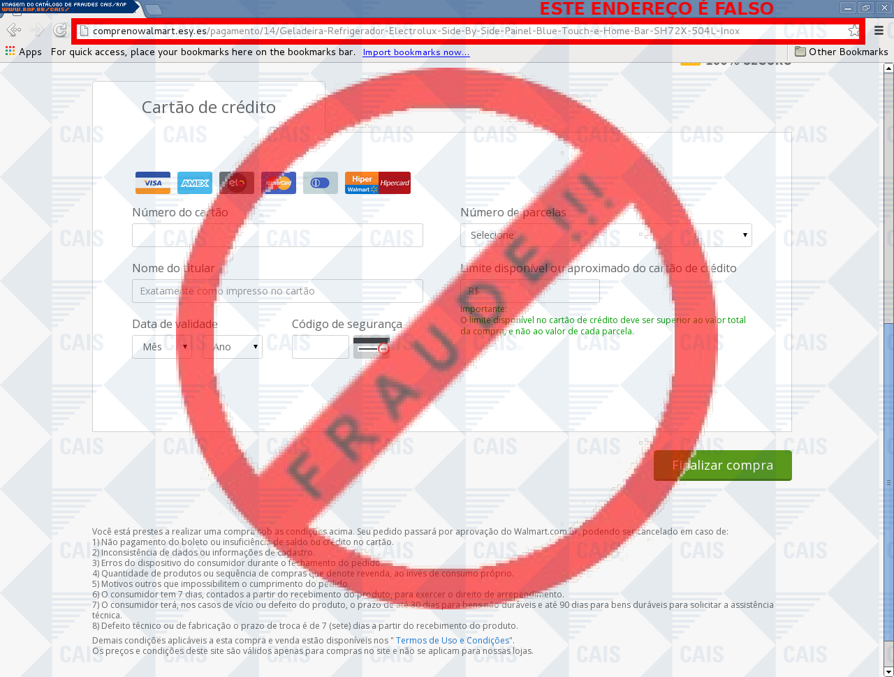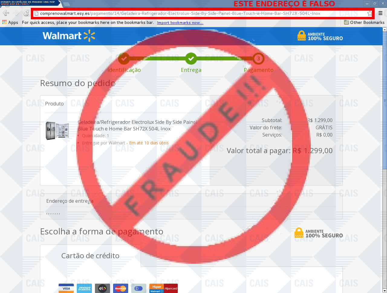 | comentário | A vítima recebe um e-mail informando sobre promoções no site de compra da Walmart disponibilizando link de vários produtos em desconto, no entanto a página é falsa destinada a roubar as informações pessoais e do cartão do usuário. | |