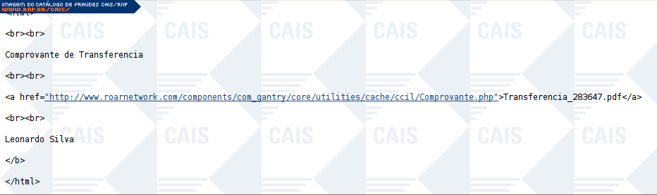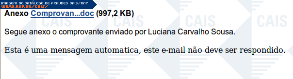 | comentário | A fraude possui um link para um suposto comprovante de depósito. O link leva a um arquivo malicioso que foi identificado com Trojan.Win32.VB (Ikarus). | |