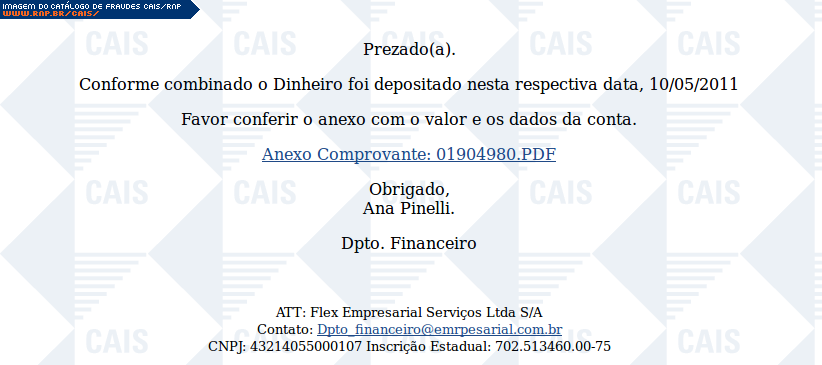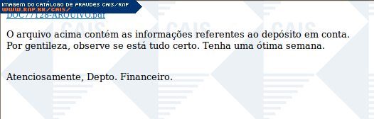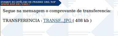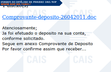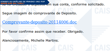| comentário | A mensagem contém um link para o suposto comprovante de um depósito que teria sido efetuado na conta da vítima. O link leva ao malware Trojan.Crypt.Delf.AG (BitDefender). | |