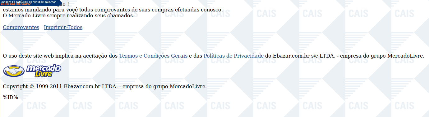 | comentário | A mensagem se passa pelo Mercado Livre que estaria enviando comprovantes de compras. O link para os supostos comprovantes levam a conteúdo malicioso que não estava disponível no momento da análise. | |