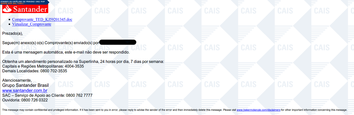 | comentário | A fraude, em nome do banco Santander, contém um link para um suposto comprovante de transferência. O link para o suposto comprovante leva a um software malicioso que foi identificado como HEUR:Trojan.Win32.Generic (Kaspersky). | |