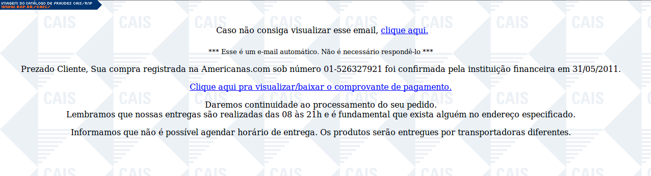 Esta página tem função informativa e educativa. Exibe uma coleção de imagens de phishing scam (fraudes eletrônicas) ou malware (código malicioso) veiculados por meio de spam (e-mail não-solicitado). Trata-se de conteúdo exemplificativo, não exaustivo, uma vez que não é possível contemplar todos os casos de fraudes existentes. Assim, caso você tenha conhecimento de um exemplar que não esteja aqui presente, isto não significa que não seja válido ou real. Inclusive incentivamos que você o envie para análise do CAIS para que, se for o caso, passe a integrar o nosso acervo.