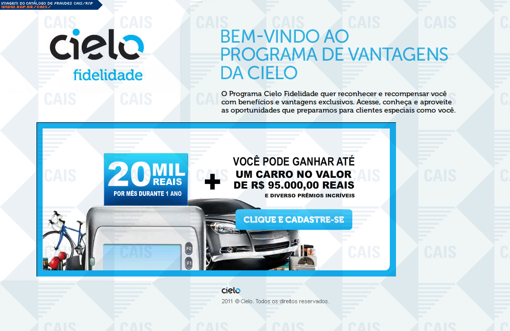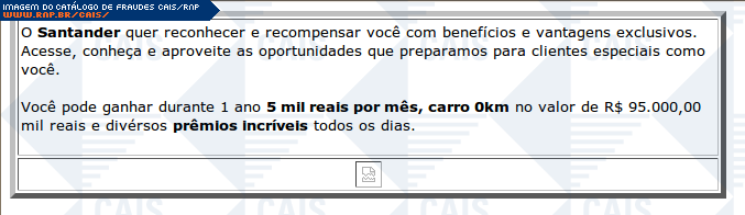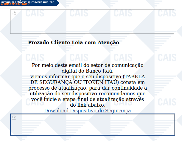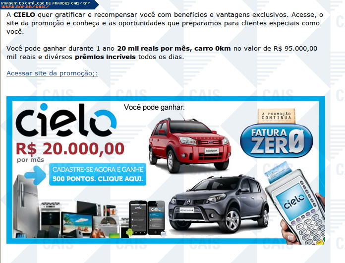Esta página tem função informativa e educativa. Exibe uma coleção de imagens de phishing scam (fraudes eletrônicas) ou malware (código malicioso) veiculados por meio de spam (e-mail não-solicitado). Trata-se de conteúdo exemplificativo, não exaustivo, uma vez que não é possível contemplar todos os casos de fraudes existentes. Assim, caso você tenha conhecimento de um exemplar que não esteja aqui presente, isto não significa que não seja válido ou real. Inclusive incentivamos que você o envie para análise do CAIS para que, se for o caso, passe a integrar o nosso acervo.