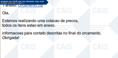 | comentário | A mensagem se passa pelo envio de uma lista de ítens para a realização de um orçamento. O arquivo é malicioso e foi identificado como Trojan-PWS.Banker5 (Ikarus). | |